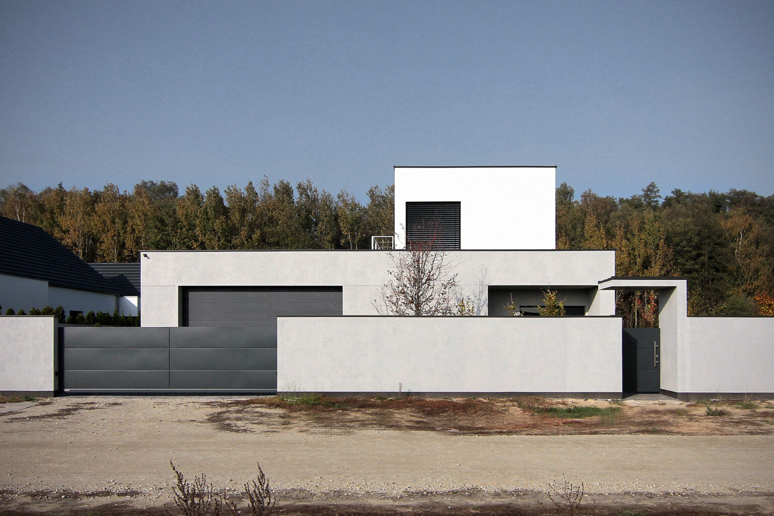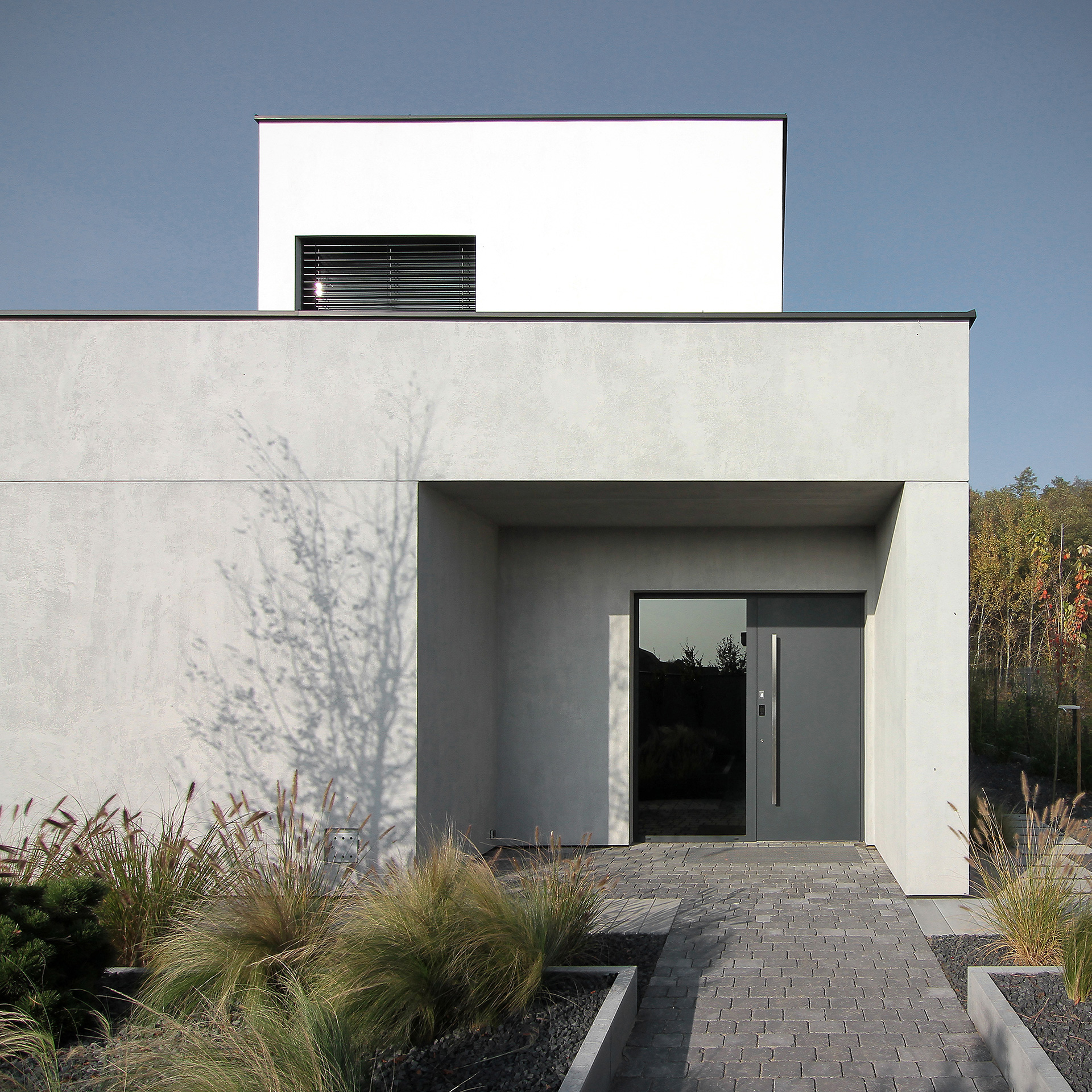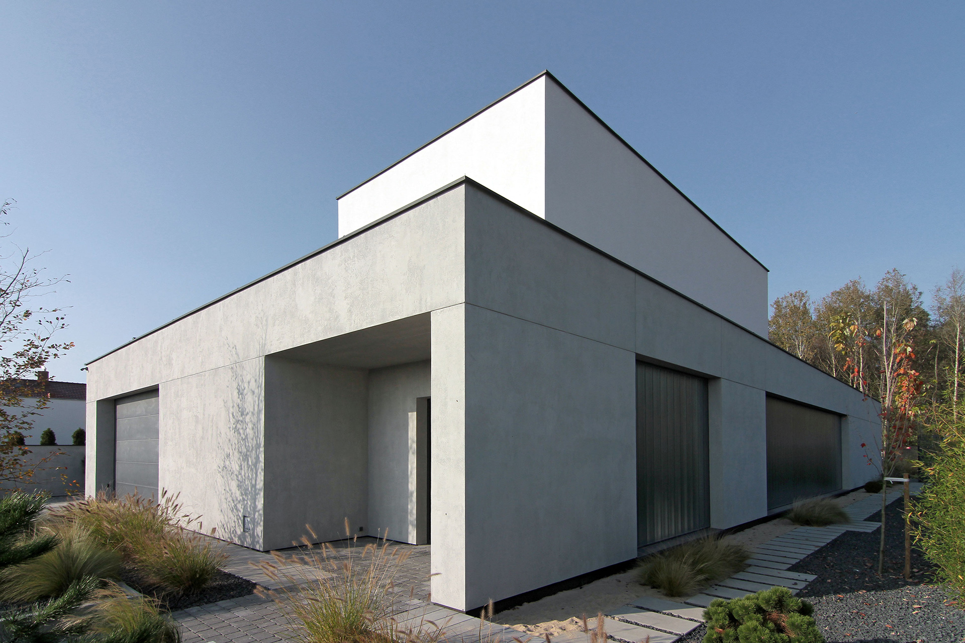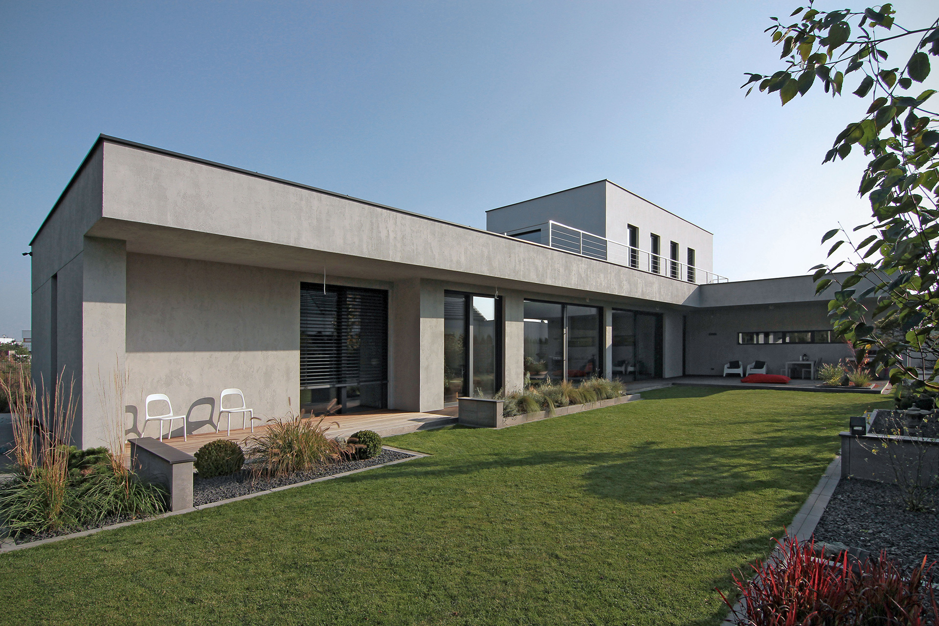 The L-shaped house, due to its shape perfectly opens up to the garden and surrounding greenery. It is an one-storey building, with only one additional form built up to two storeys. It matches its surroundings not only because of its height, but also because of the finishing materials. For the ground floor the single material used is light grey concrete. What contrasts with a monolite form are also glass walls in the eastern side, which due to their vertical modules introduce a rhythm to the elevation.