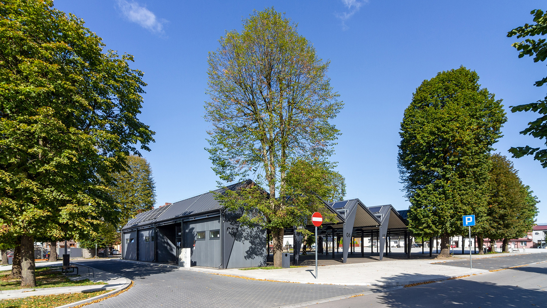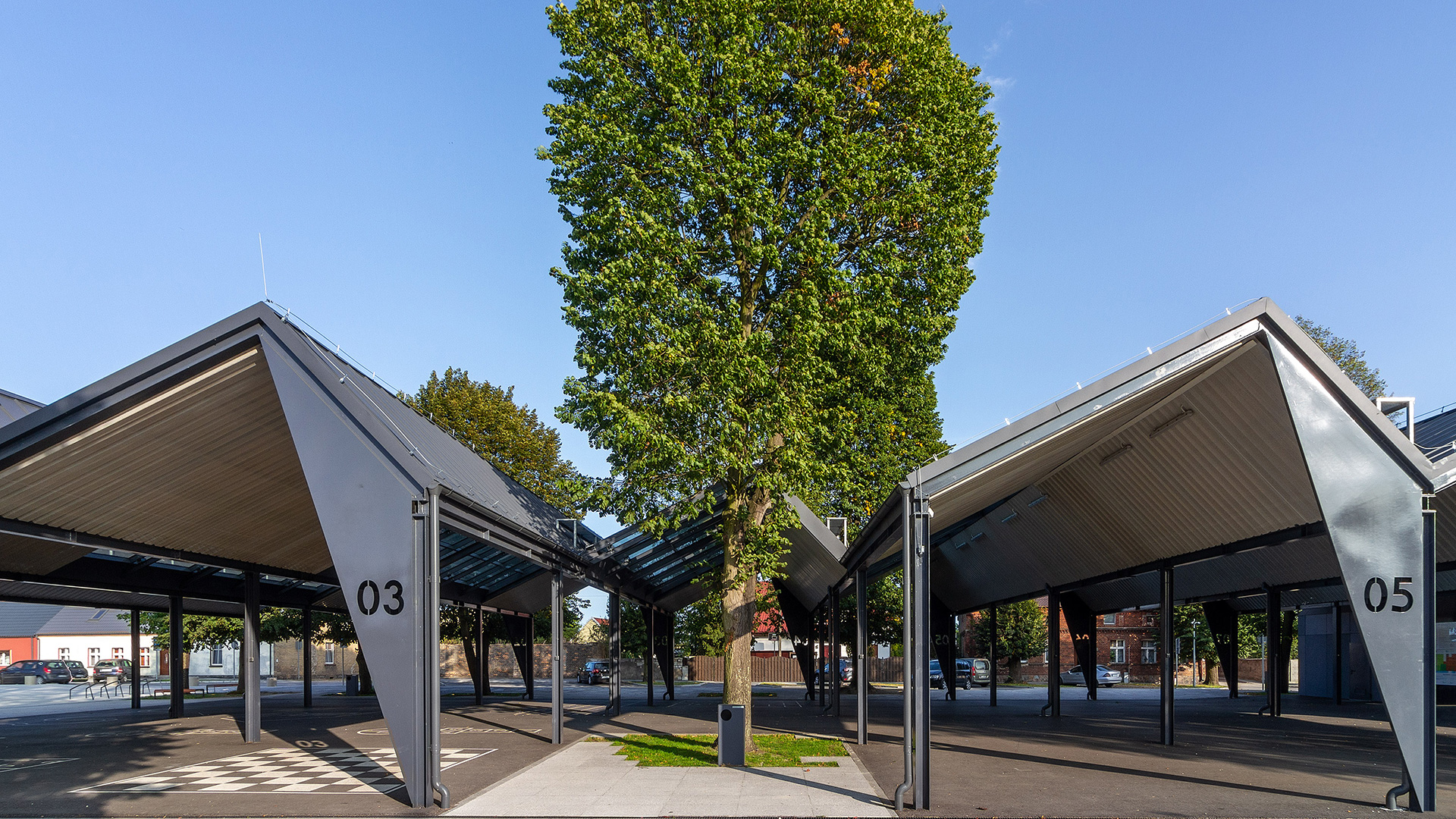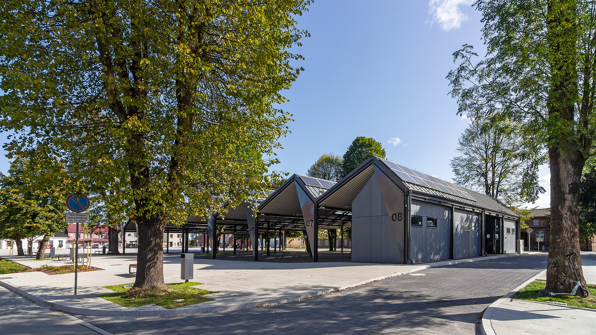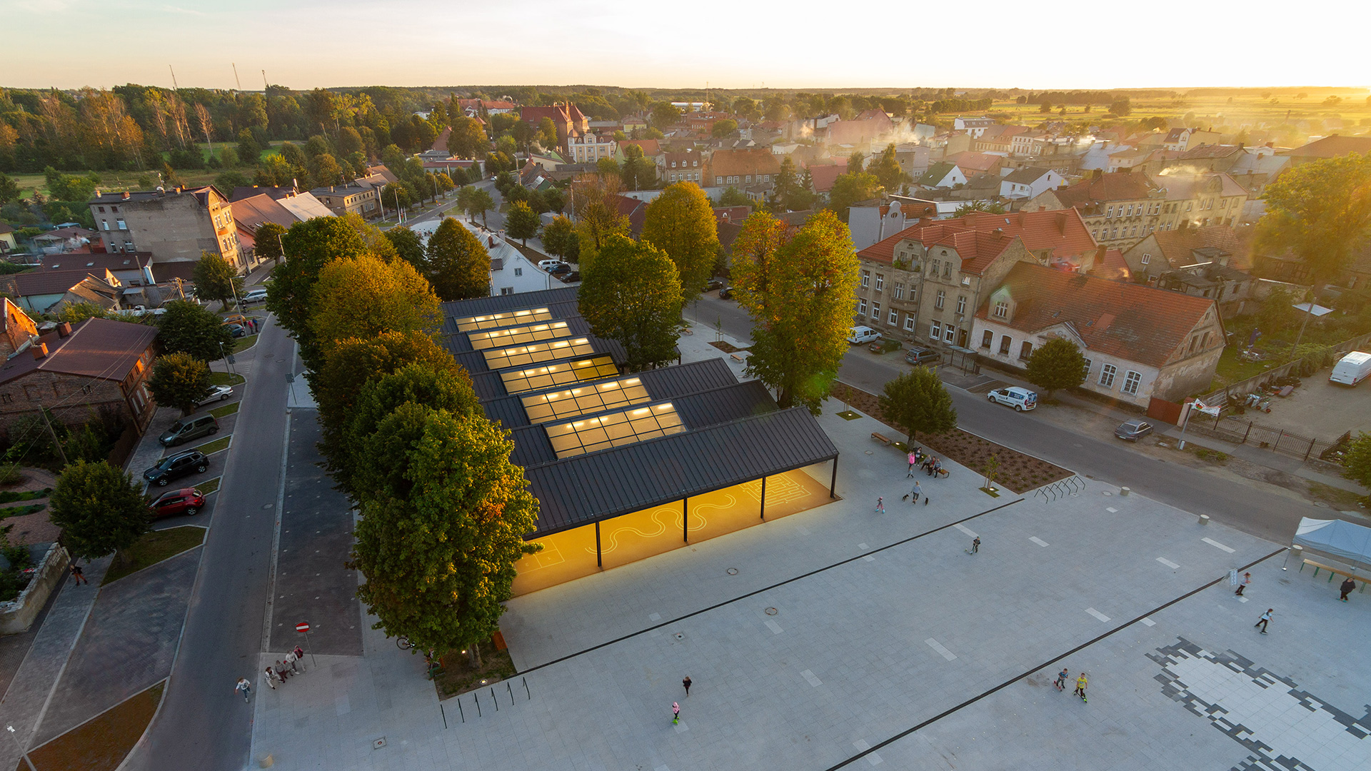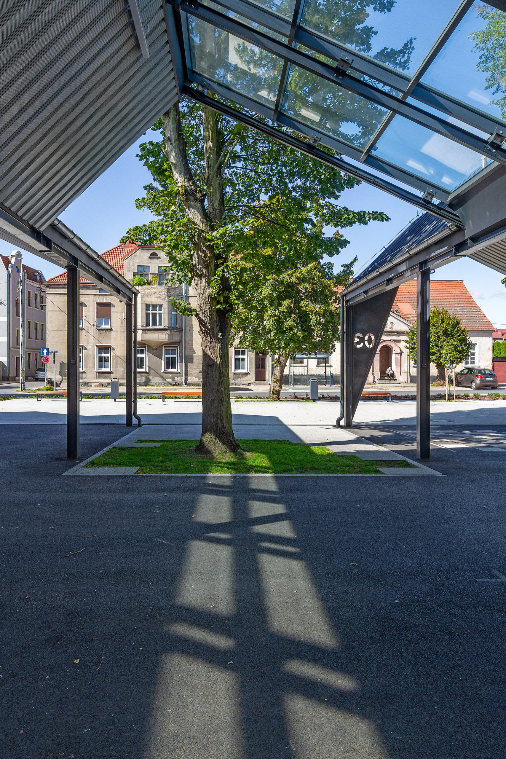 The design assumption of the second part – the central square – was to fit the new market as best as possible into the arrangement of growing 100-year-old linden trees, which meant that no trees were cut for the project and the sick specimens that could not be saved were replaced with new plantings. The central square is a city marketplace with an asphalt floor, on which a collection of games for children and market places are marked. The object of the market is a modular steel shed on a rectangular plan with a U-shaped cut and spans finished with sheet metal in the pattern of an origami drawing. The fifth elevation has been finished with a standing seam sheet and partly made of glass on aluminum profiles as a natural illumination of the exhibition stands.