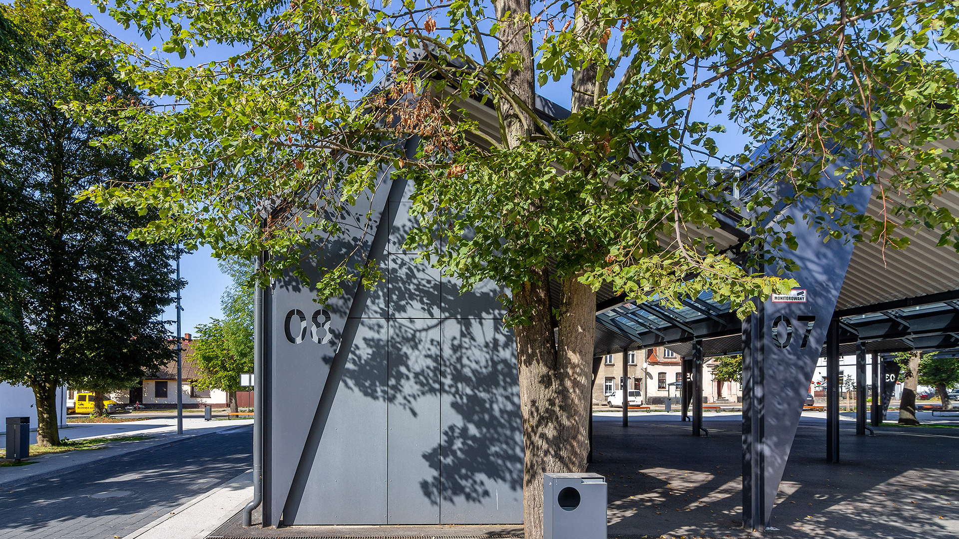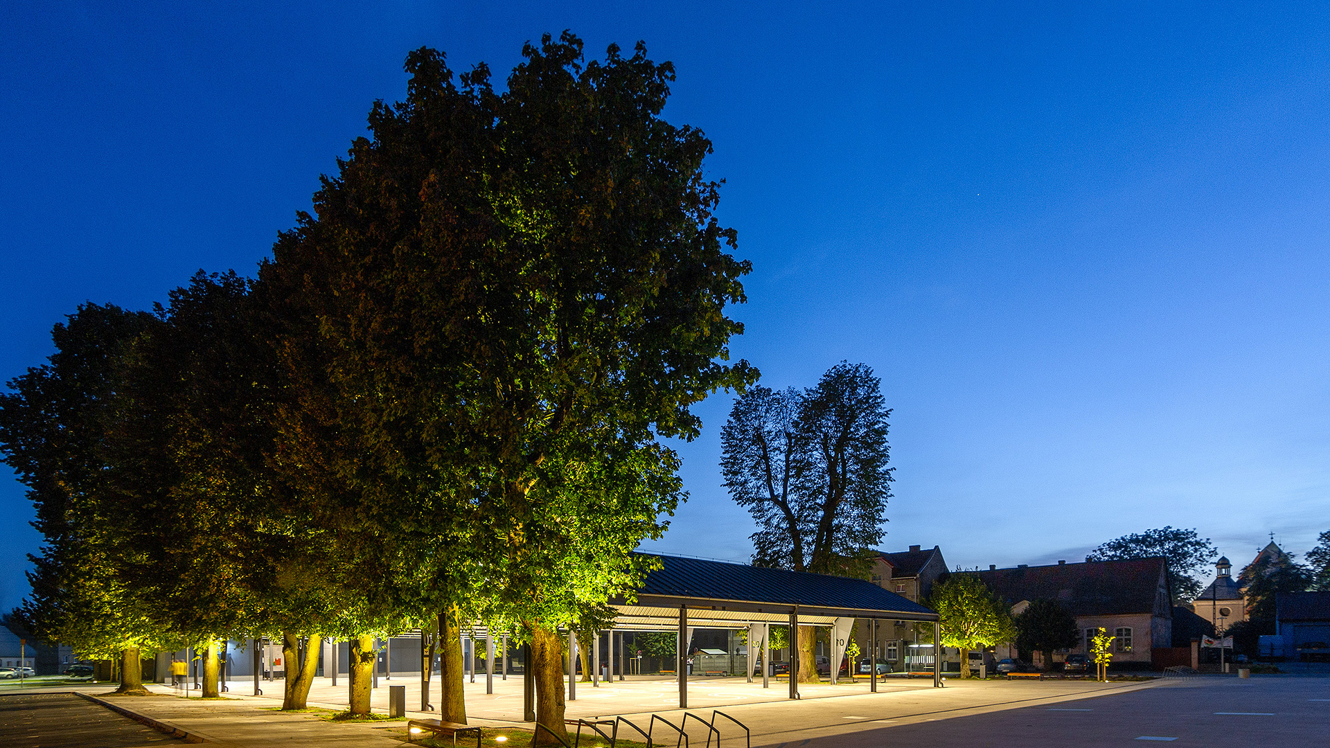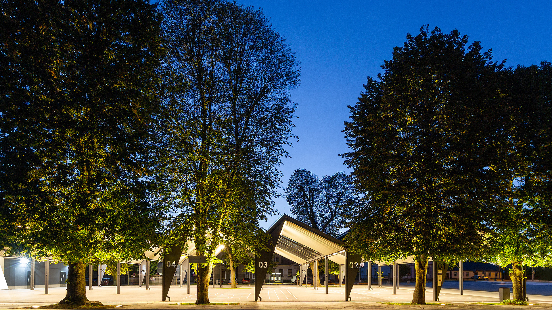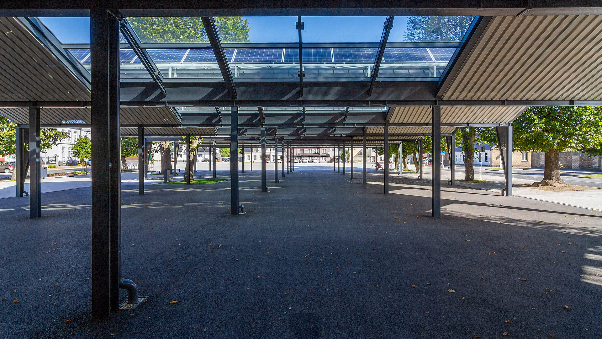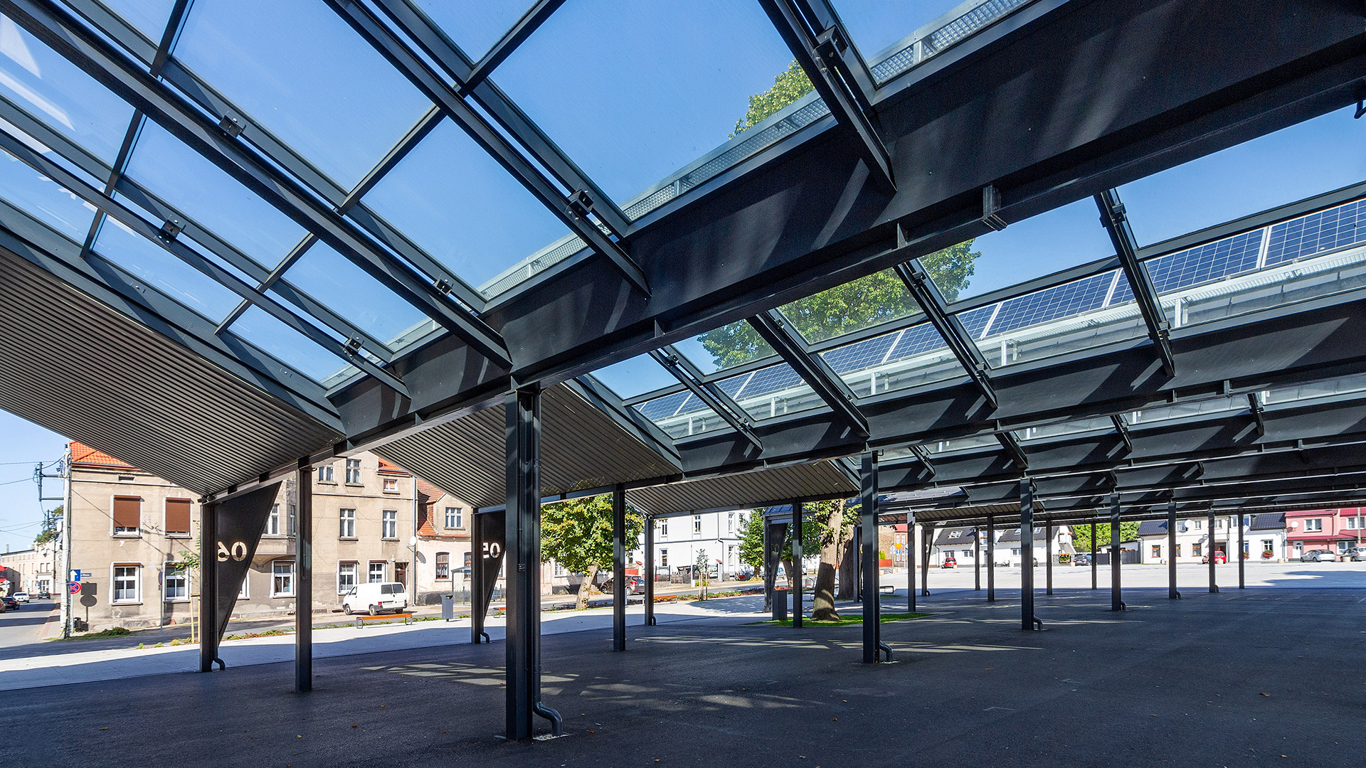 The design assumption of the second part – the central square – was to fit the new market as best as possible into the arrangement of growing 100-year-old linden trees, which meant that no trees were cut for the project and the sick specimens that could not be saved were replaced with new plantings. The central square is a city marketplace with an asphalt floor, on which a collection of games for children and market places are marked. The object of the market is a modular steel shed on a rectangular plan with a U-shaped cut and spans finished with sheet metal in the pattern of an origami drawing. The fifth elevation has been finished with a standing seam sheet and partly made of glass on aluminum profiles as a natural illumination of the exhibition stands.