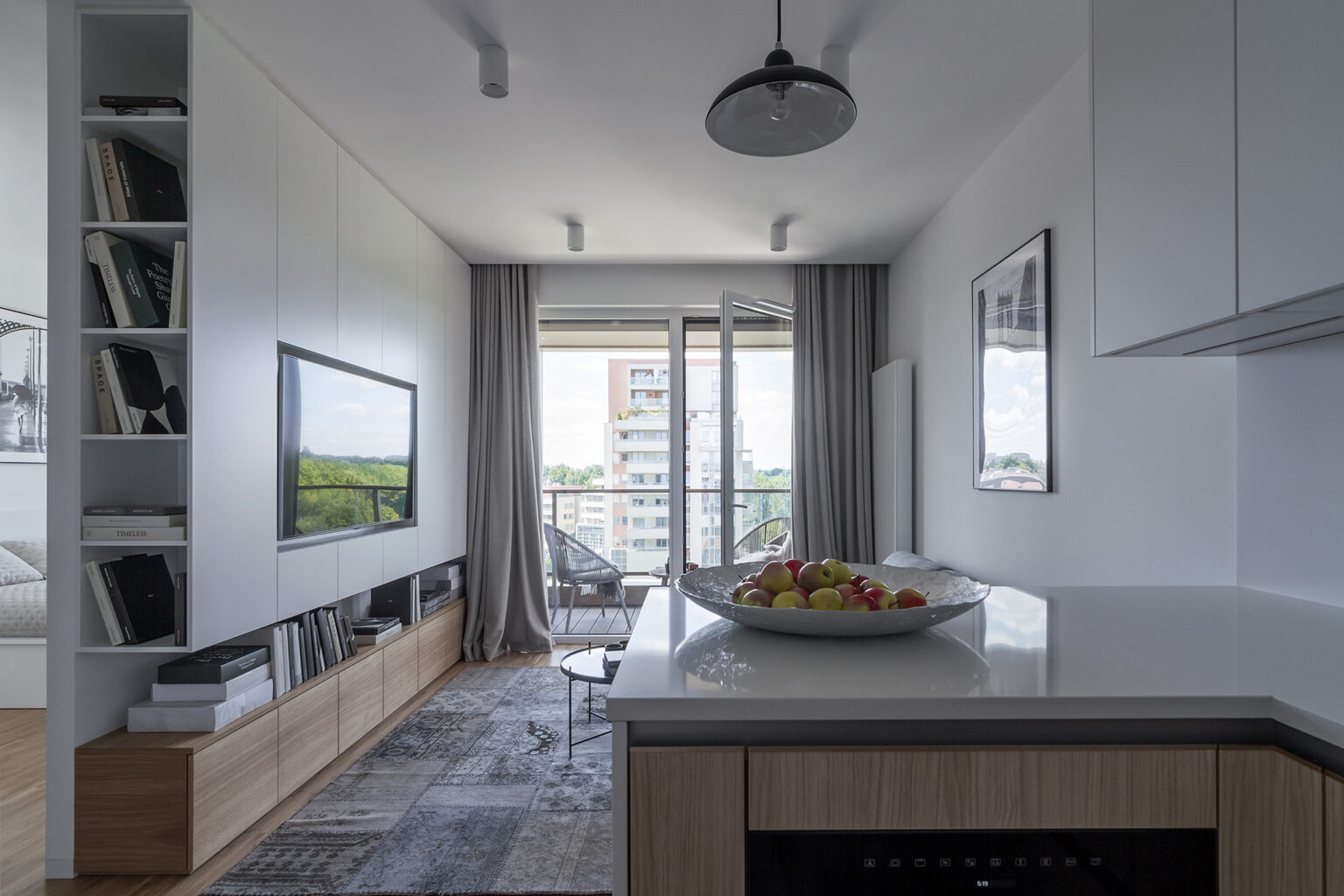 Funkcjonalność wnętrza została dokładnie przemyślana. Pomimo niewielkiej powierzchni, apartament oferuje wszystkie niezbędne udogodnienia. Projektant wnętrz Poznań skupił się na optymalnym wykorzystaniu dostępnej przestrzeni, co zaowocowało stworzeniem praktycznego układu pomieszczeń. Przestrzeń dzienną stanowi salon z aneksem kuchennym, który jest sercem apartamentu. Dzięki otwartej przestrzeni, wnętrze wydaje się większe, a jednocześnie pozwala na łatwe przenikanie światła pomiędzy poszczególnymi strefami.