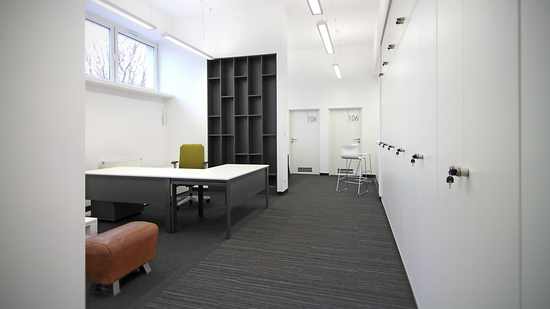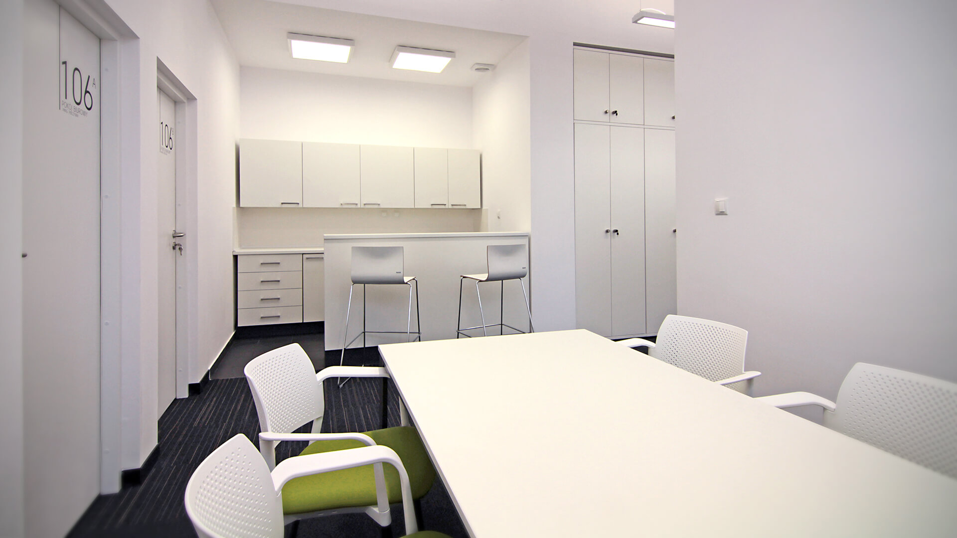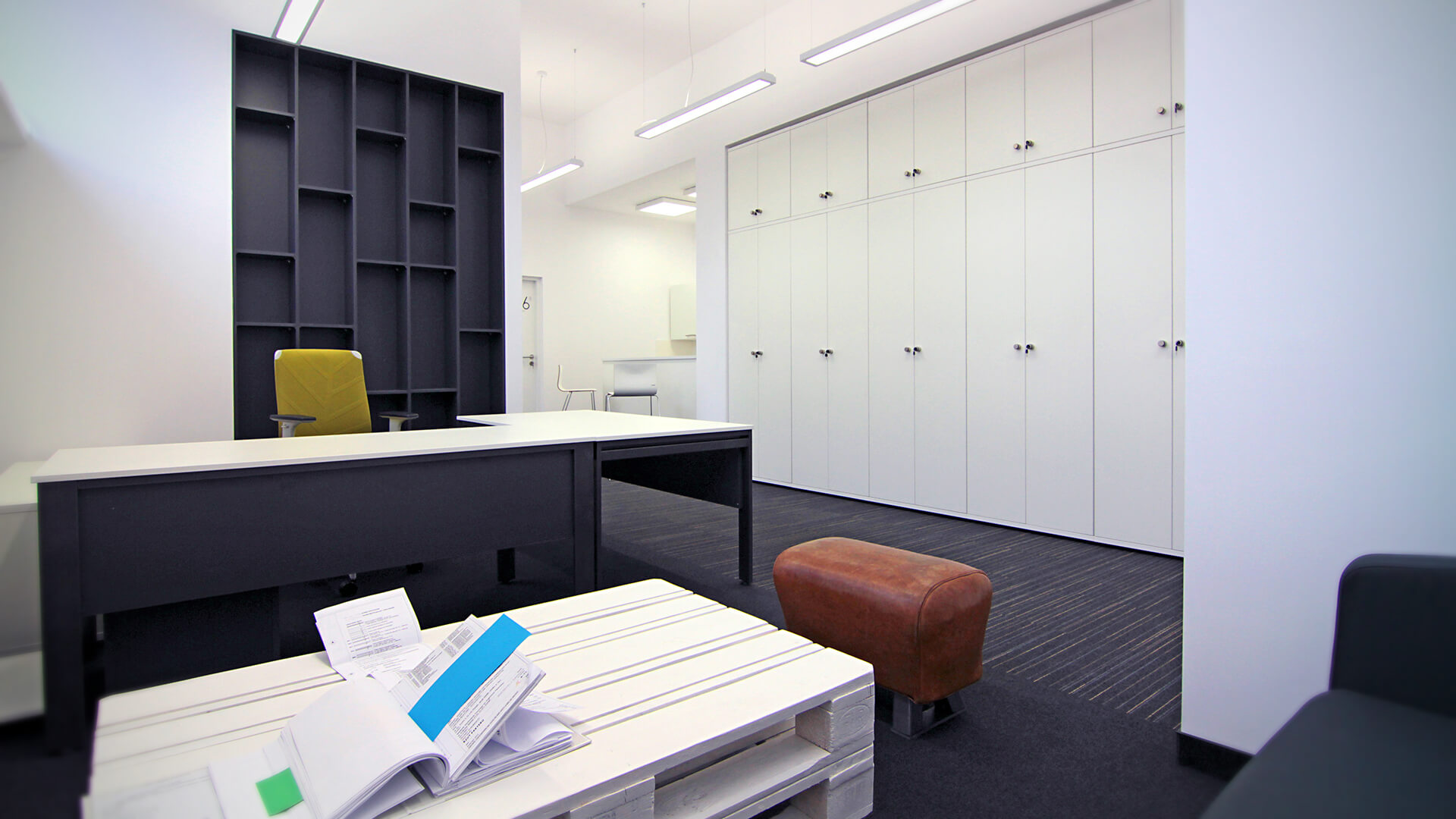 Kolorem dominującym w projekcie wnętrz zakładu dydaktycznego gimnastyki i ćwiczeń muzyczno-ruchowych jest kolor biały. Elementami dopełniającymi jest czarna typografia opisów pomieszczeń oraz czarne matowe meble i pojedyncze ściany pomalowane na ten kolor. Najbardziej charakterystyczny akcent tego projektu stanowią żółte grafiki ścienne, związane tematycznie z funkcją projektowanych wnętrz.
