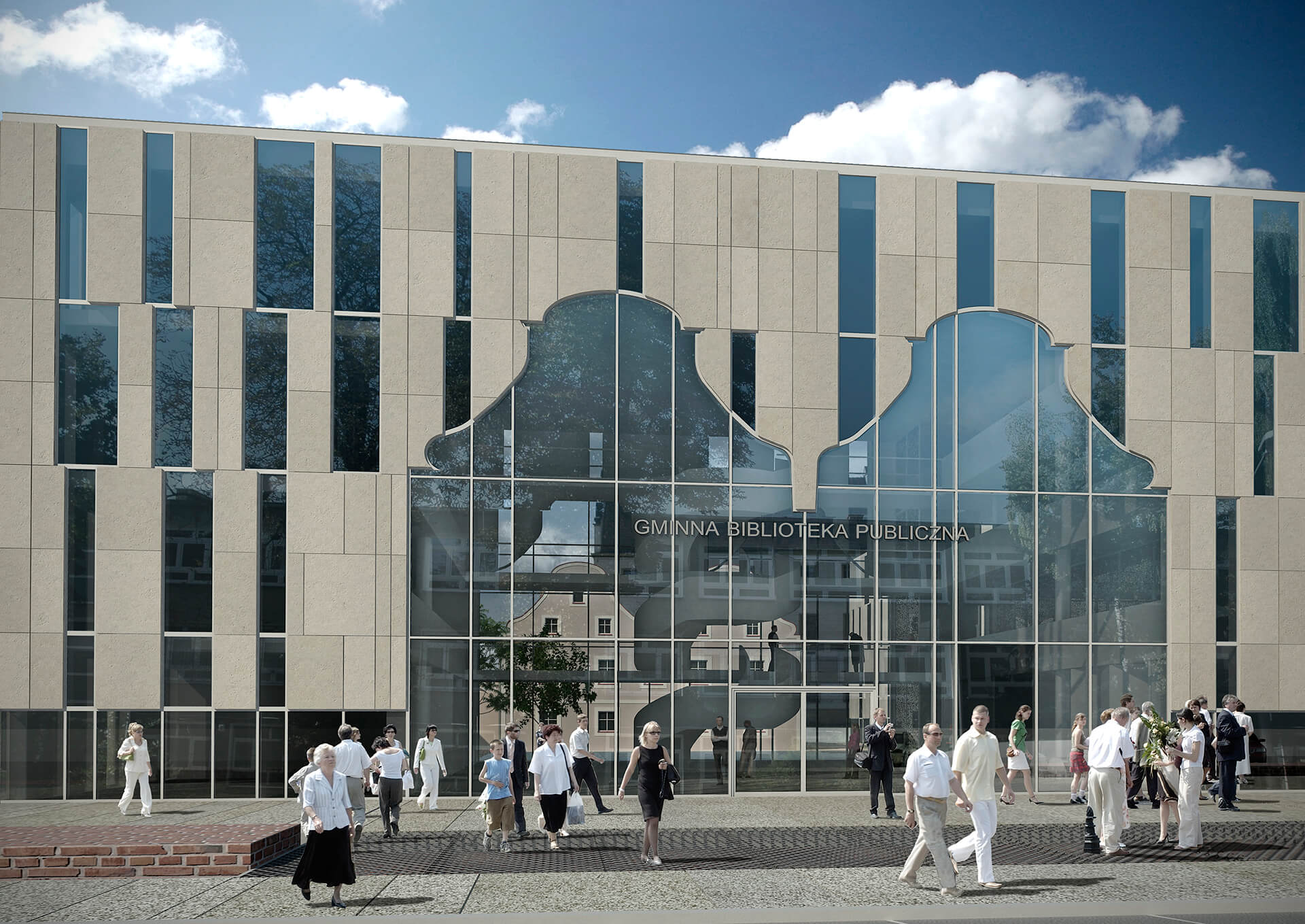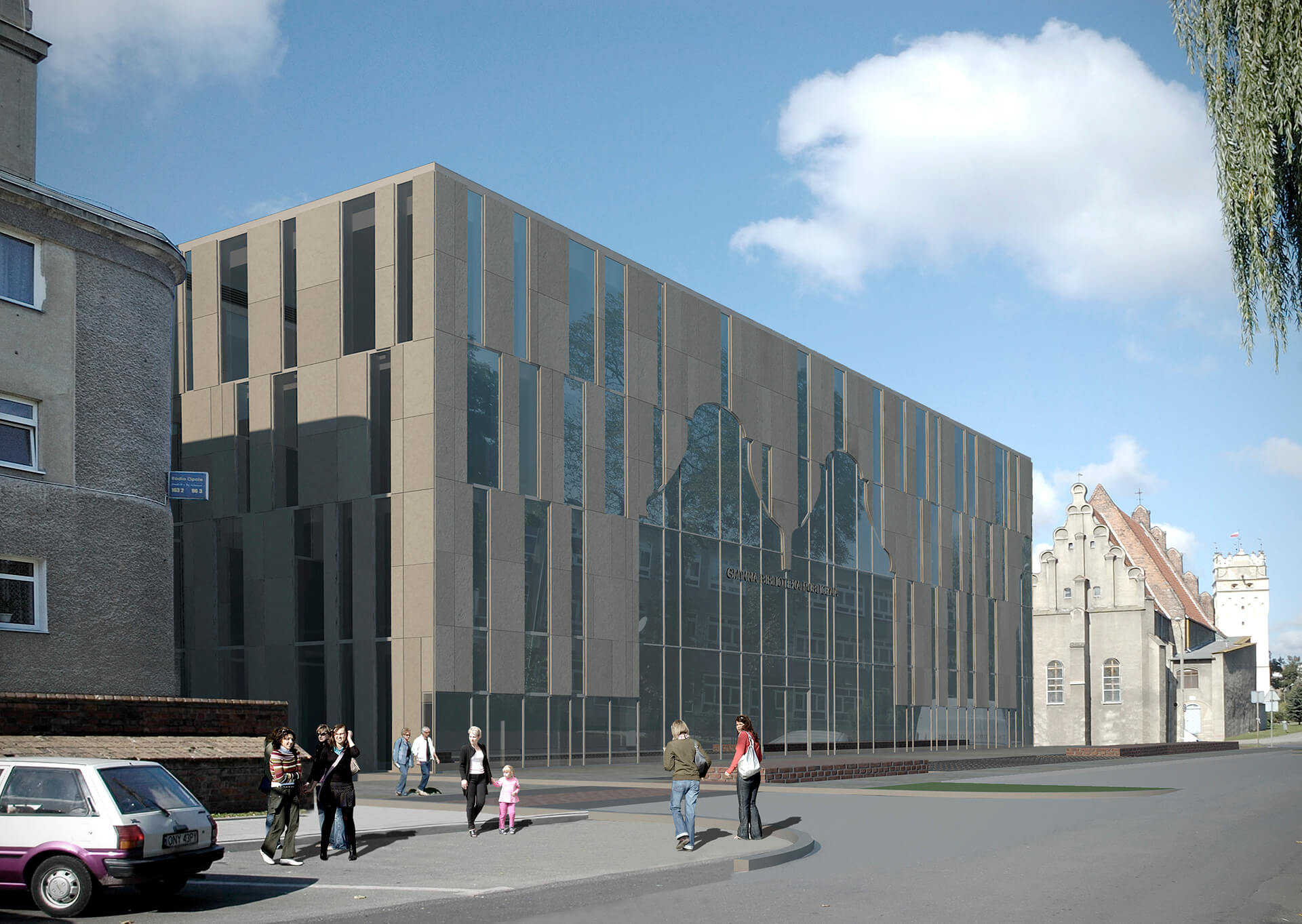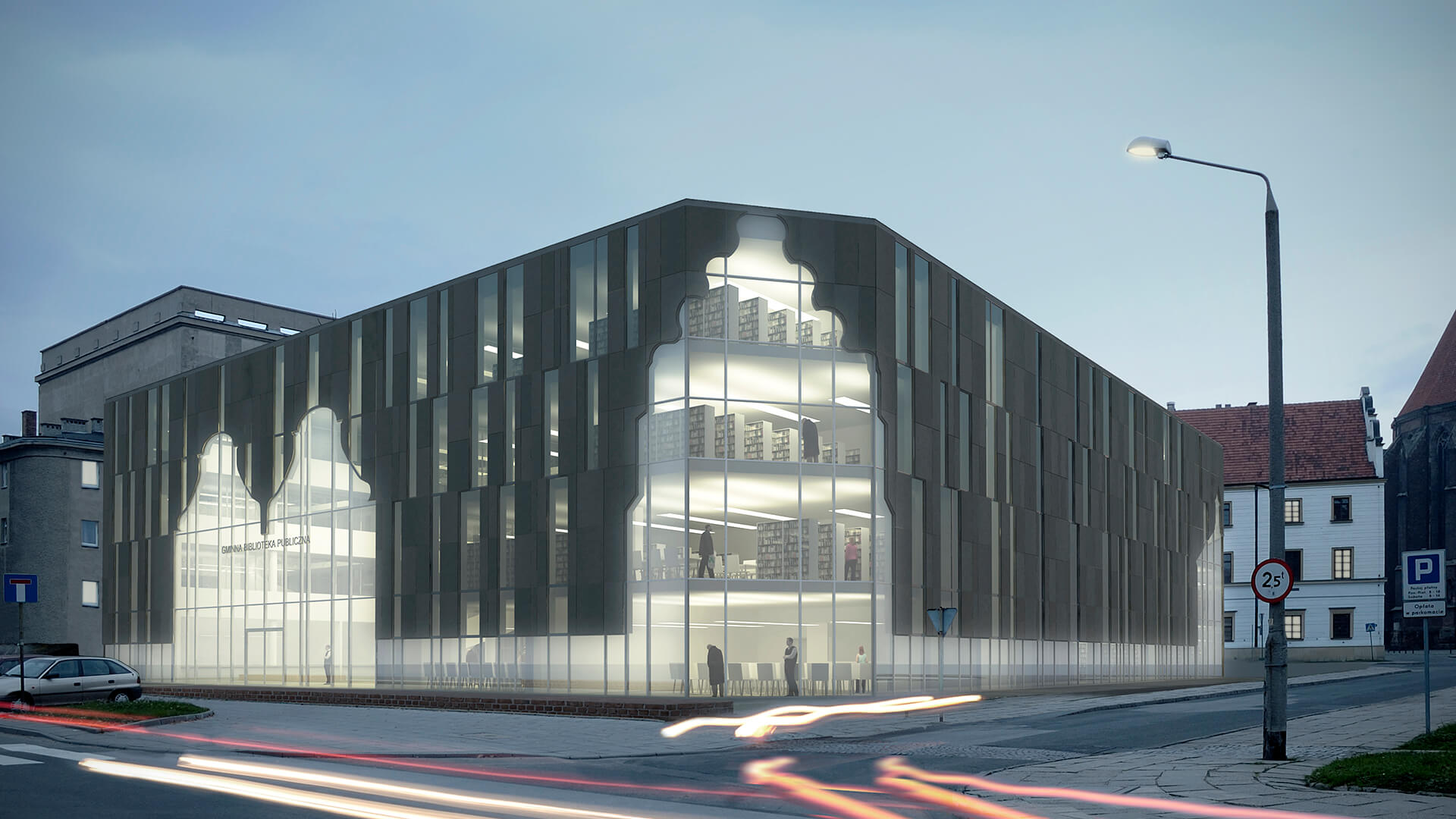 Zwarta bryła biblioteki domyka kwartał zabudowy ujednolicając i porządkując mocno rozczłonkowany fragment ścisłego centrum historycznego miasta. Projektowany budynek niemal dosłownie prowadzi dialog z istniejącym otoczeniem cytując poszczególne jego fragmenty w postaci przeszkleń fasadowych elewacji. Jest to nasza odpowiedź na zróżnicowany kontekst miejsca o wysokich walorach architektonicznych.