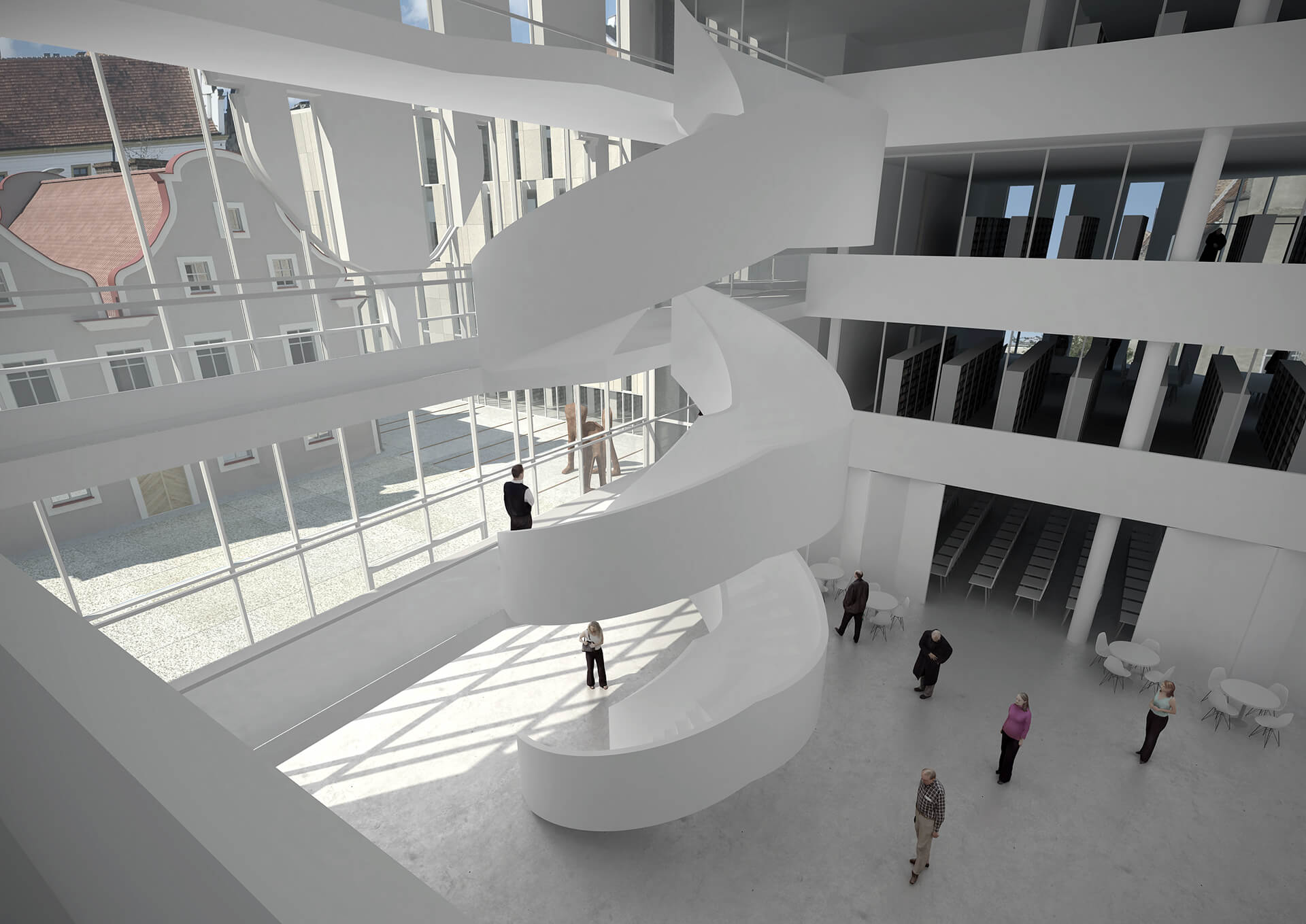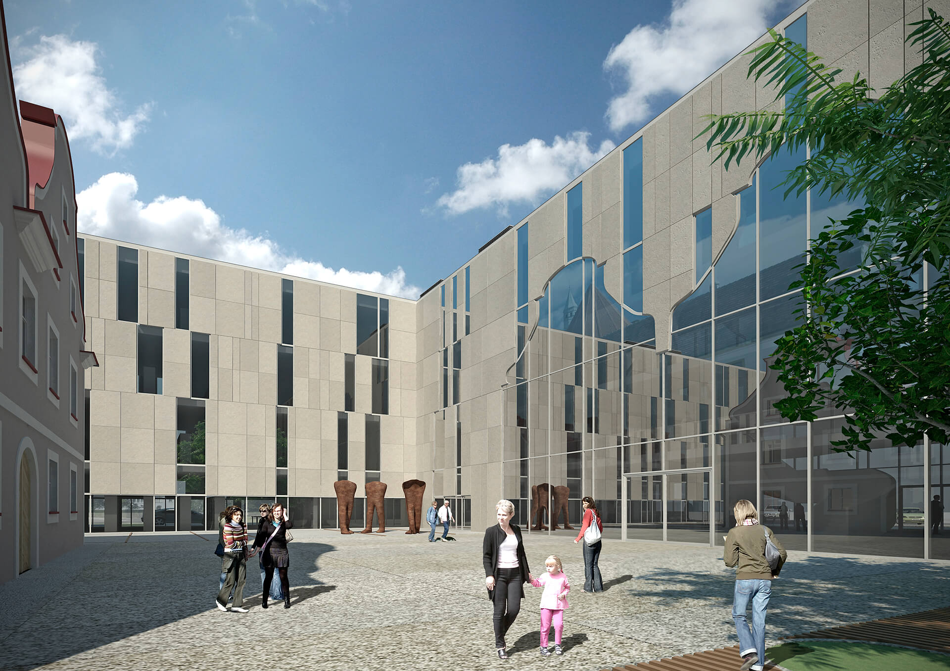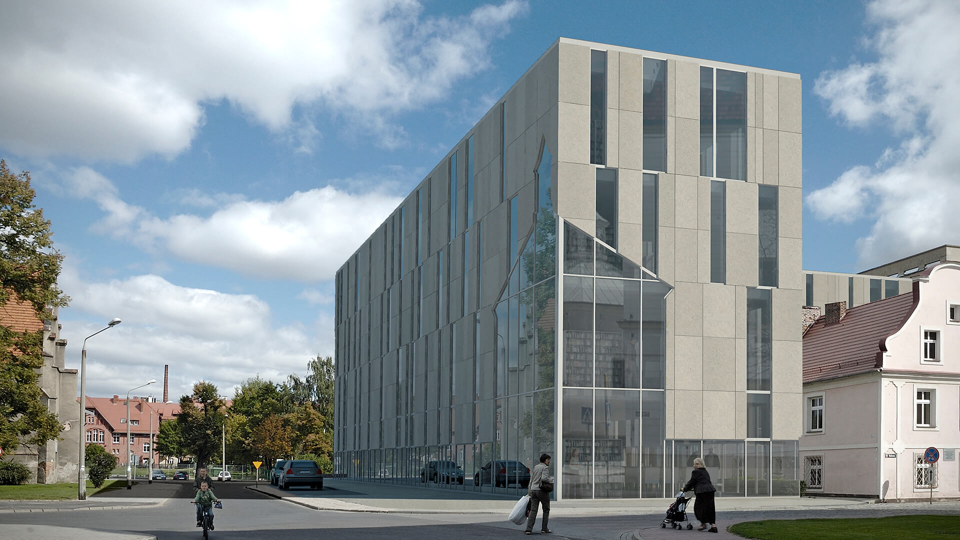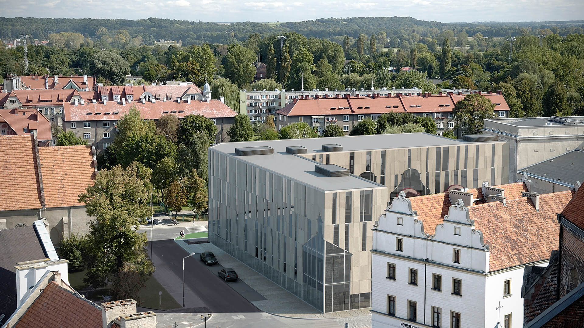 Zwarta bryła biblioteki domyka kwartał zabudowy ujednolicając i porządkując mocno rozczłonkowany fragment ścisłego centrum historycznego miasta. Projektowany budynek niemal dosłownie prowadzi dialog z istniejącym otoczeniem cytując poszczególne jego fragmenty w postaci przeszkleń fasadowych elewacji. Jest to nasza odpowiedź na zróżnicowany kontekst miejsca o wysokich walorach architektonicznych.