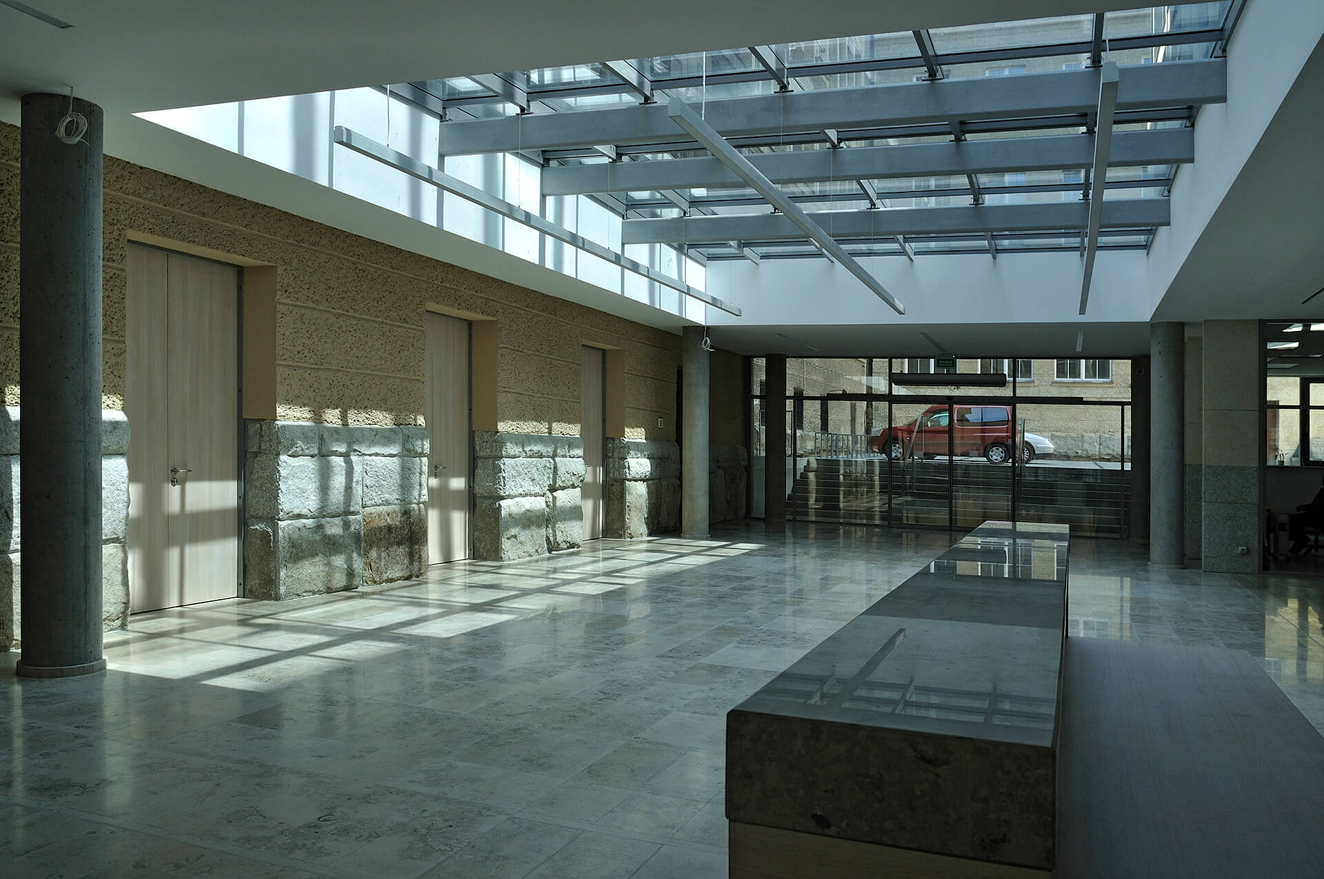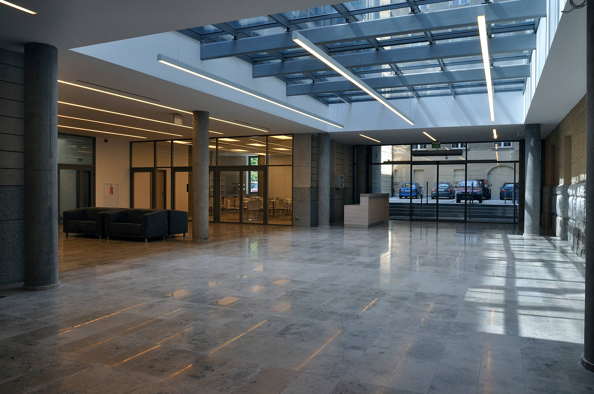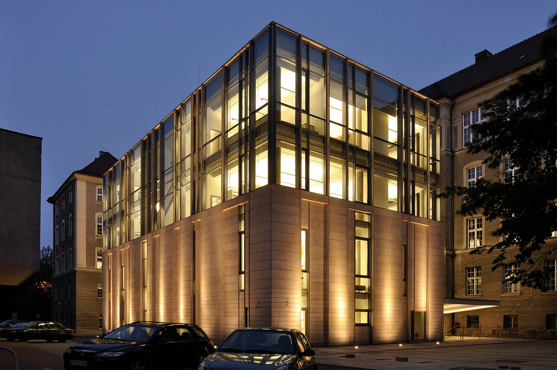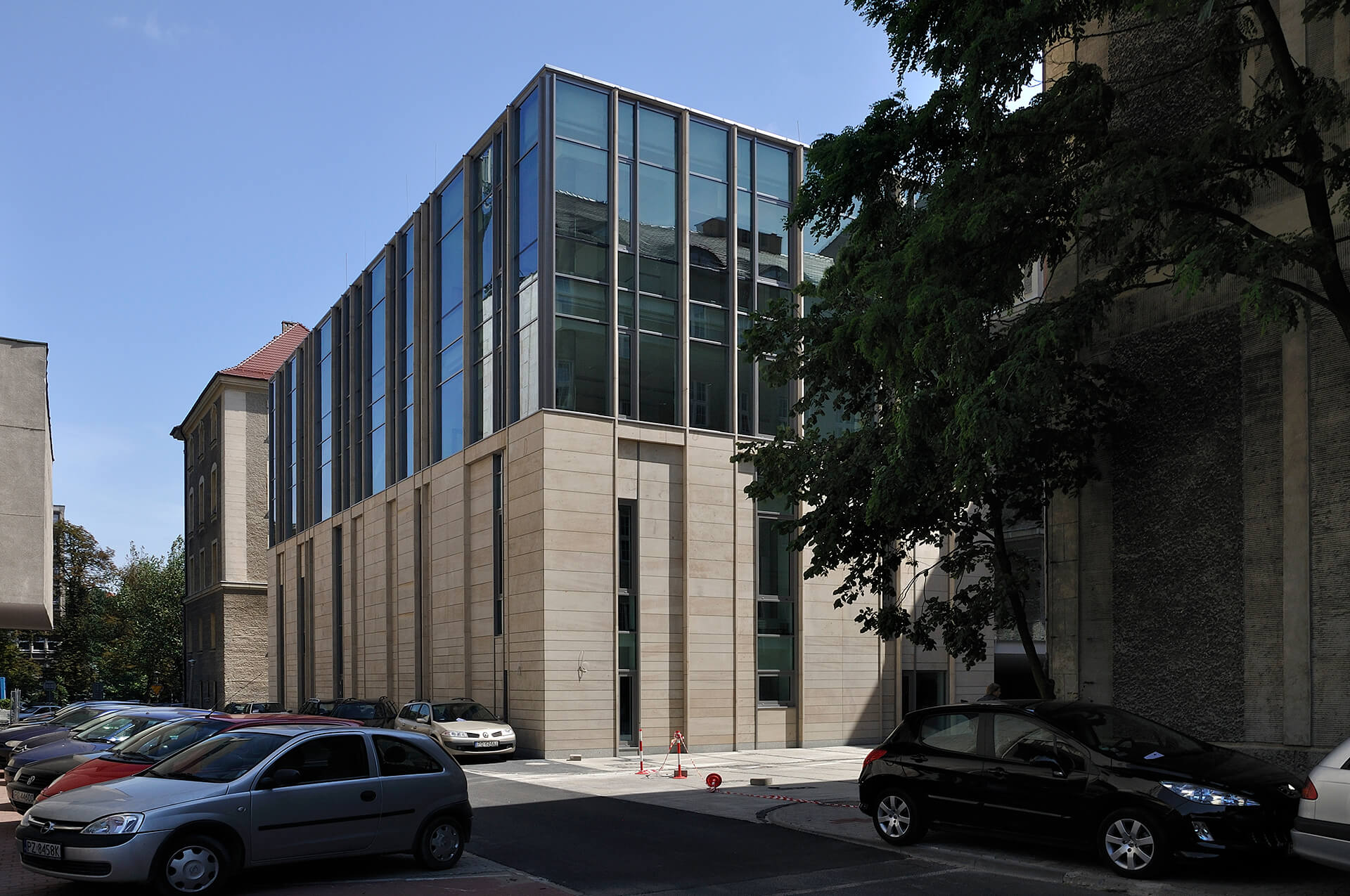 Bryłę budynku zdominowały dwa materiały – szkło i piaskowiec. Rysunek kamienia, identycznego jak na istniejącym obiekcie Collegium Maius, nawiązuje do starych podziałów, jednocześnie wprowadzając stonowane zaburzenia jego rytmu. Lekką strefę szkła i masywną kamienia łączą piaskowcowe żyletki, które ciągnąc się poprzez całą wysokość obiektu, są wolnym odzwierciedleniem wertykalnych podziałów elewacji podwórzowej zastanej zabudowy. Ślad żyletek został przeniesiony na rysunek posadzki placu oraz do wnętrz budynku.