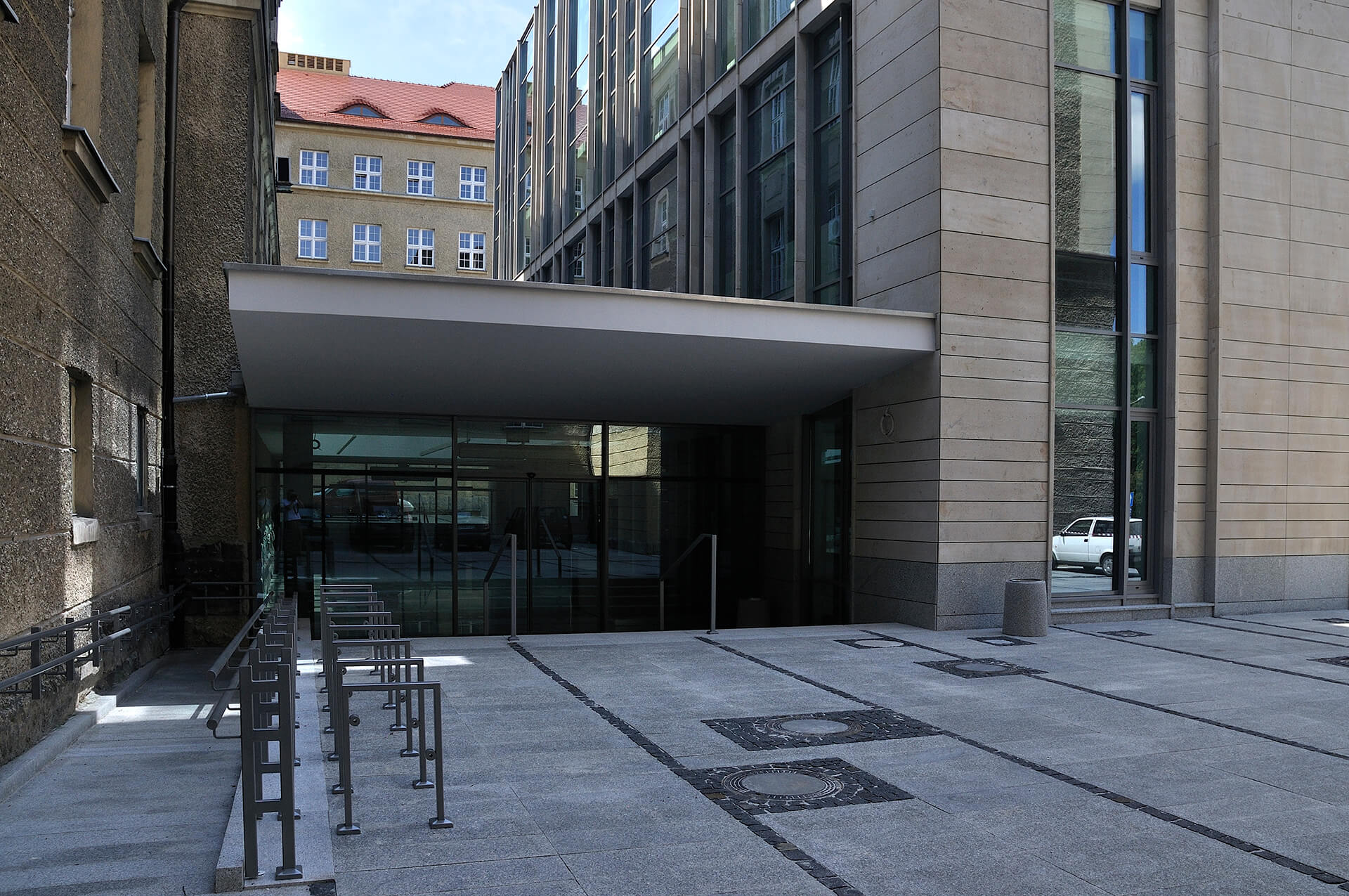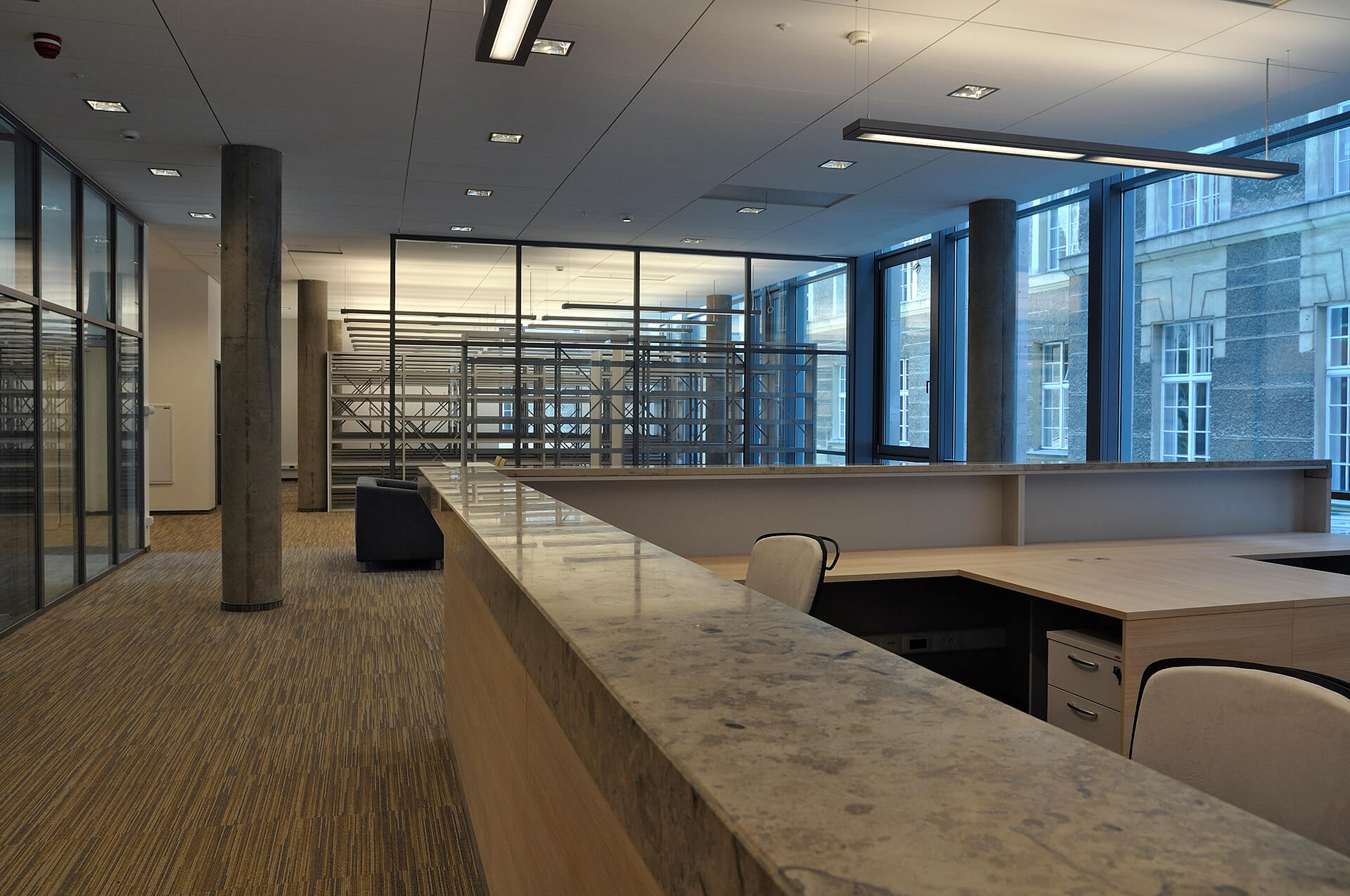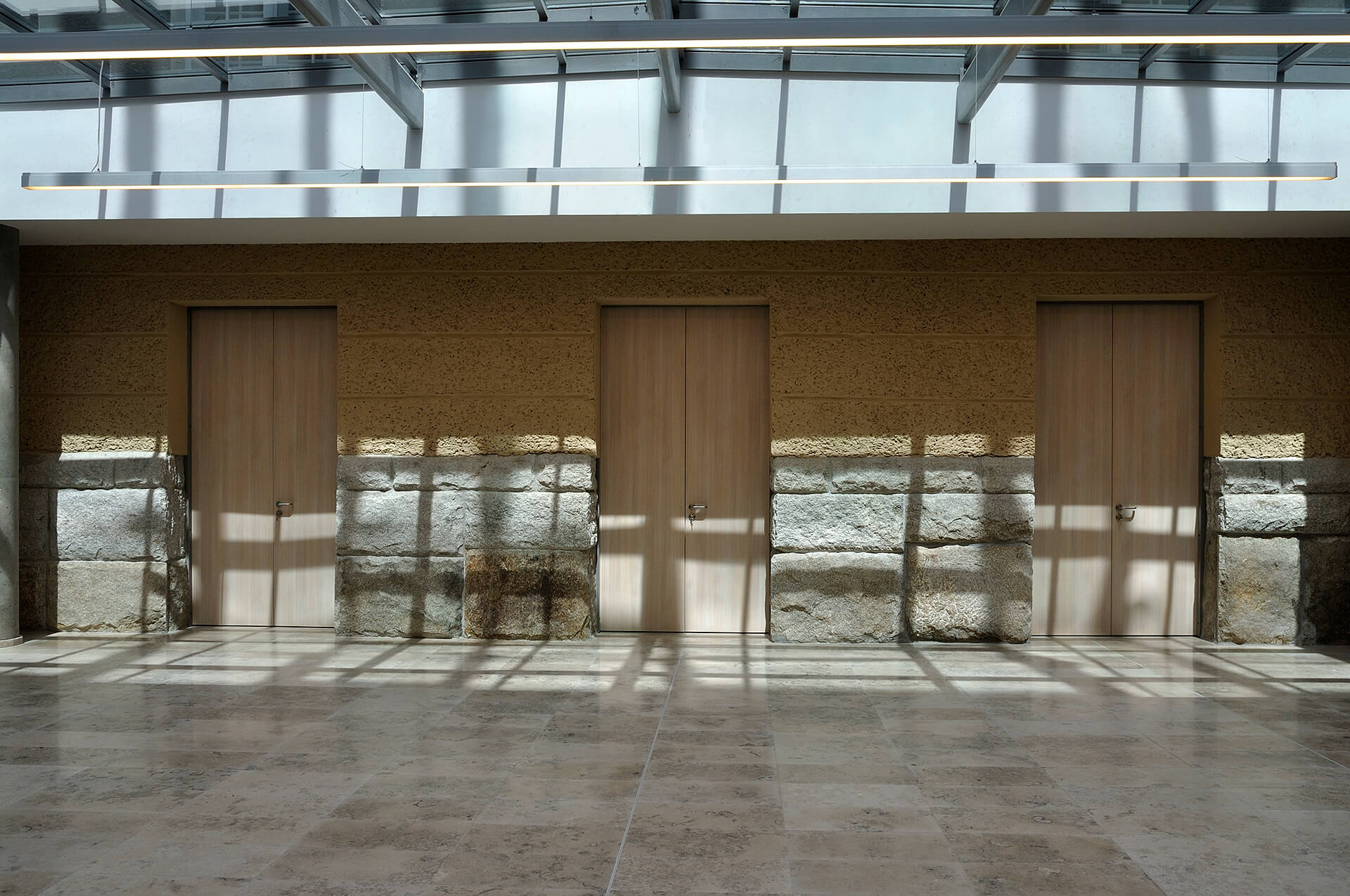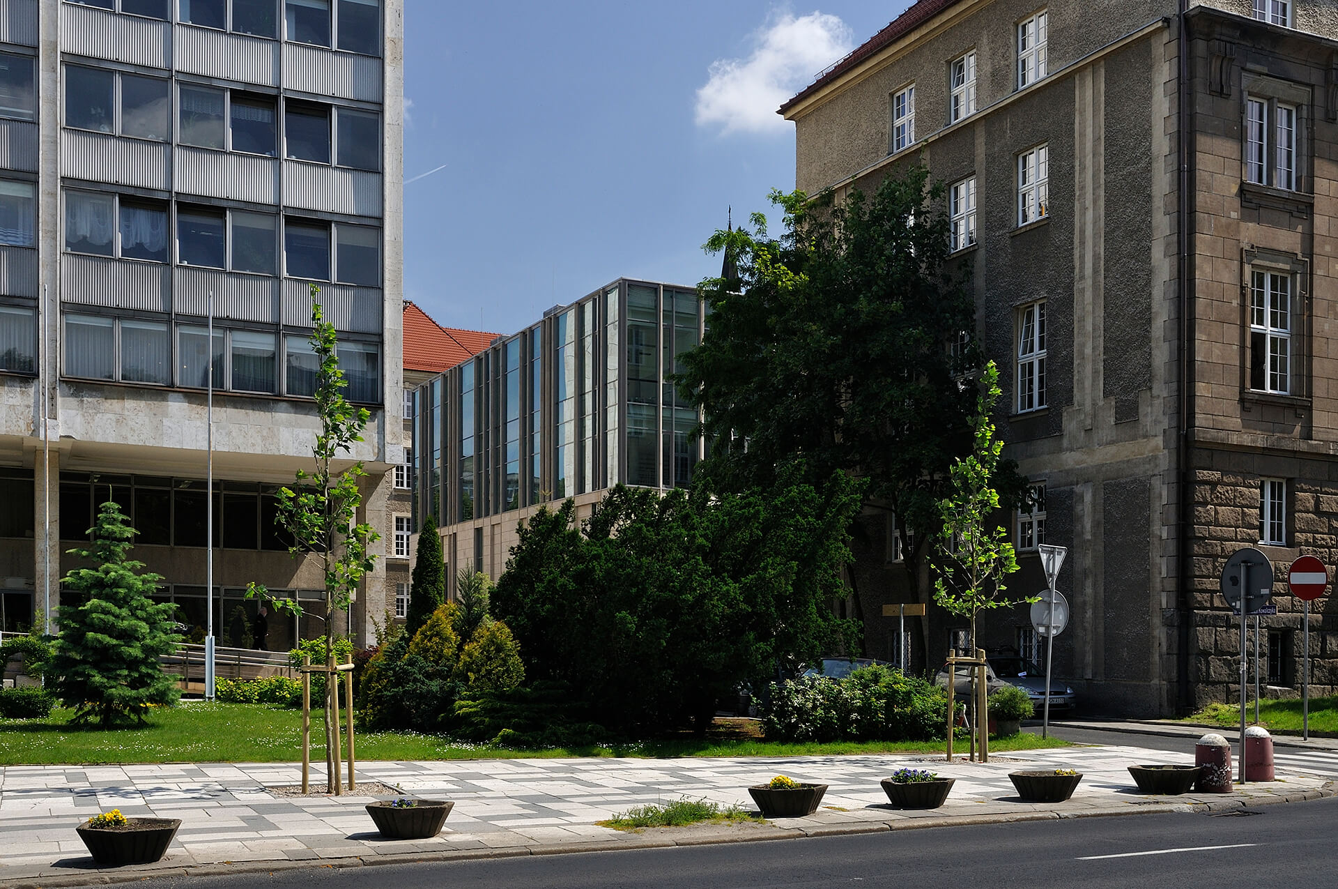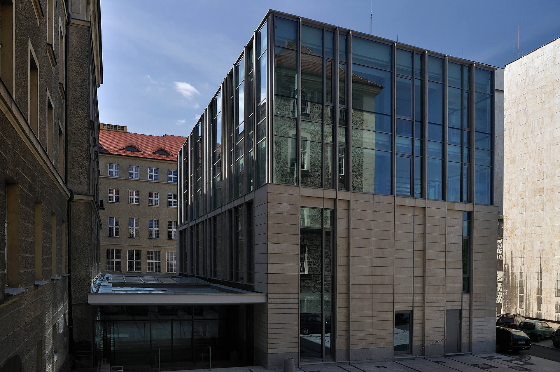 Bryłę budynku zdominowały dwa materiały – szkło i piaskowiec. Rysunek kamienia, identycznego jak na istniejącym obiekcie Collegium Maius, nawiązuje do starych podziałów, jednocześnie wprowadzając stonowane zaburzenia jego rytmu. Lekką strefę szkła i masywną kamienia łączą piaskowcowe żyletki, które ciągnąc się poprzez całą wysokość obiektu, są wolnym odzwierciedleniem wertykalnych podziałów elewacji podwórzowej zastanej zabudowy. Ślad żyletek został przeniesiony na rysunek posadzki placu oraz do wnętrz budynku.