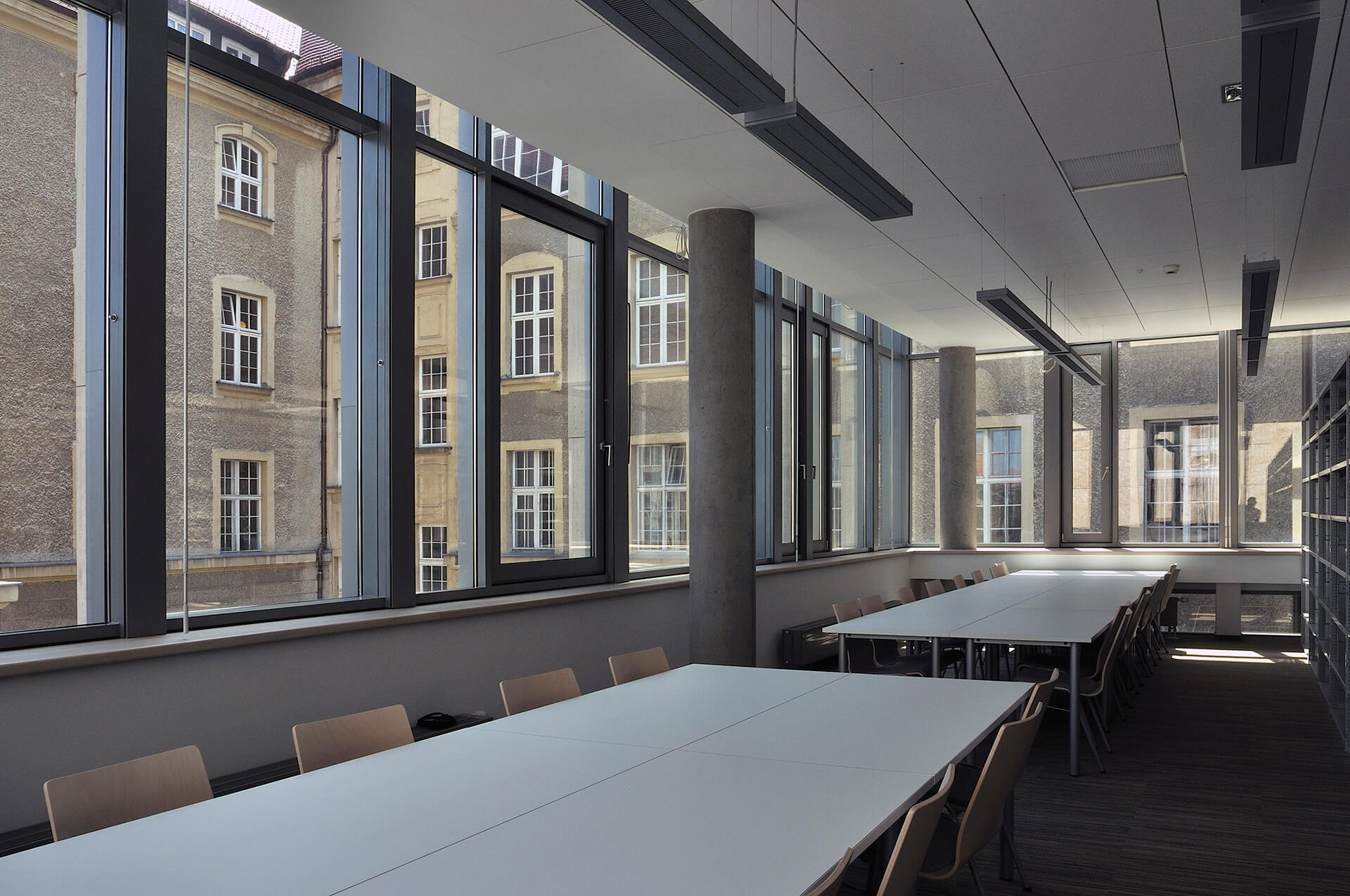 Biblioteka Wydziału Filologii Polskiej i Klasycznej Uniwersytetu Adama Mickiewicza zlokalizowana jest w okolicy wielkich realizacji pruskich z początku dwudziestego wieku, w bezpośrednim sąsiedztwie Opery i Zamku cesarskiego, tuż przy Placu Mickiewicza – sercu Poznania. Zaprojektowana jako rozbudowa Collegium Maius – dawnego budynku pruskiej Królewskiej Komisji Kolonizacyjnej (Hakaty), posiada skromną ekspozycję, zasłonięta z trzech stron przez Collegium Maius i dodatkowo przez Urząd Wojewódzki. Bryła biblioteki, przedzielona na pół, z masywnym dołem z piaskowca i lekką górą ze szkła, w zamyśle autorów pokazywać ma połączenie historii ze współczesnością.