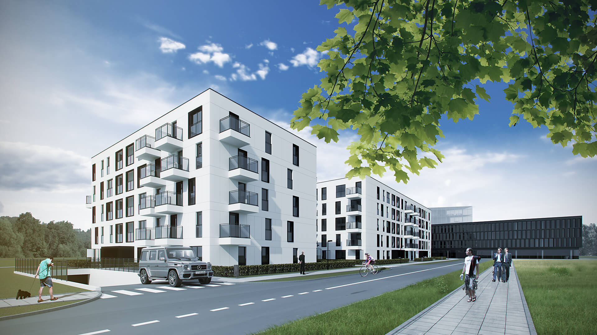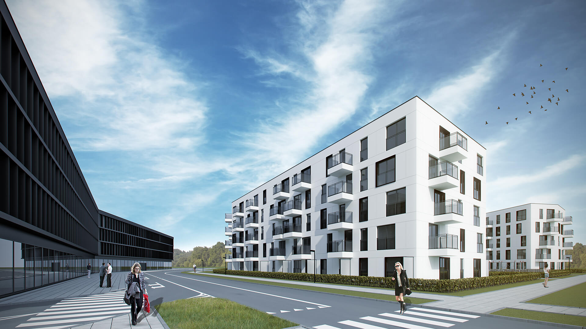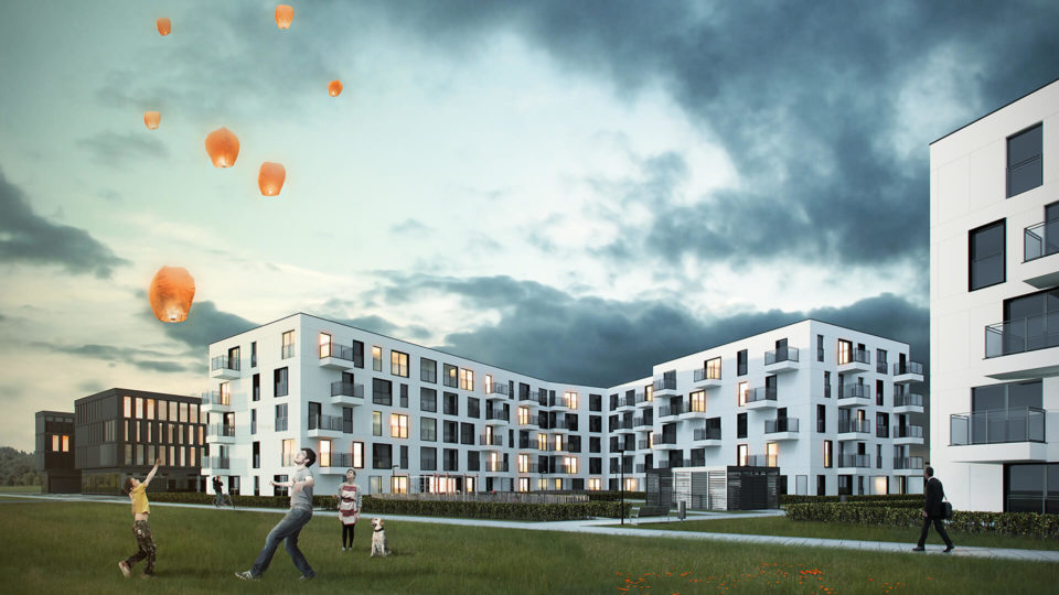 Plan założenia jest kompromisem pomiędzy możliwie najbardziej korzystnymi warunkami życia mieszkańców – naświetleniem stref mieszkalnych, ochroną przed hałasem i intymnością przestrzeni pół-publiczne, a quasi śródmiejskim charakterem zabudowy, wyznaczonym przez obowiązujący Miejscowy Plan Zagospodarowania Przestrzeni. Zaproponowany układ pozwolił na stworzenie interesującej przestrzeni wewnętrznej z częścią rekreacyjną. Zorganizowana zieleń niska oddziela przestrzeń publiczną od prywatnej. Bryły budynków charakteryzują się regularną siatką podziałów elewacji z wejściami w podcieniach i niesymetrycznie rozmieszczonymi lunetami w kolorze stolarki okiennej. W związku z potrzebnym doświetleniem mieszkań, balkony w bryłach zostały rozmieszczone nieregularnie, co nadaje wyjątkowego charakteru całości założenia.