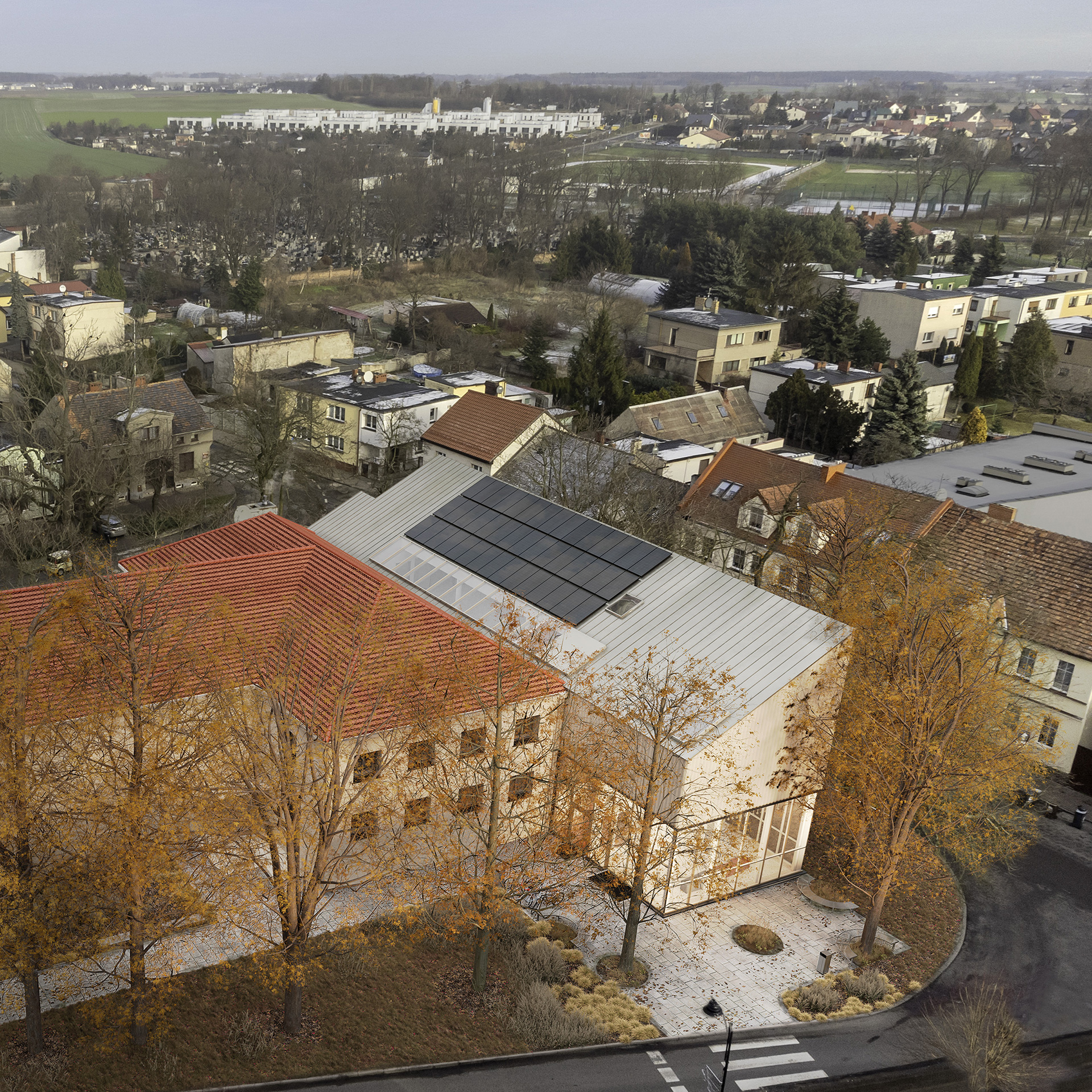 Warto również wspomnieć o planowanej termomodernizacji starego budynku. Projekt zakłada zastosowanie nowoczesnych technologii, które nie tylko poprawią efektywność energetyczną obiektu, ale również ujednolicą wygląd nowej i starej części budynku. Biuro projektowe z Poznania postawiło na spójność estetyczną, wybierając dla całej bryły jasną barwę elewacji. Mimo to, nowe skrzydło będzie wyróżniać się inną fakturą ścian, wykonaną ze szkła piankowego, co doda budynkowi nowoczesnego charakteru.