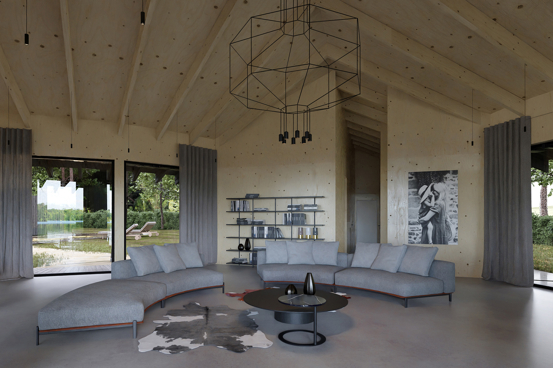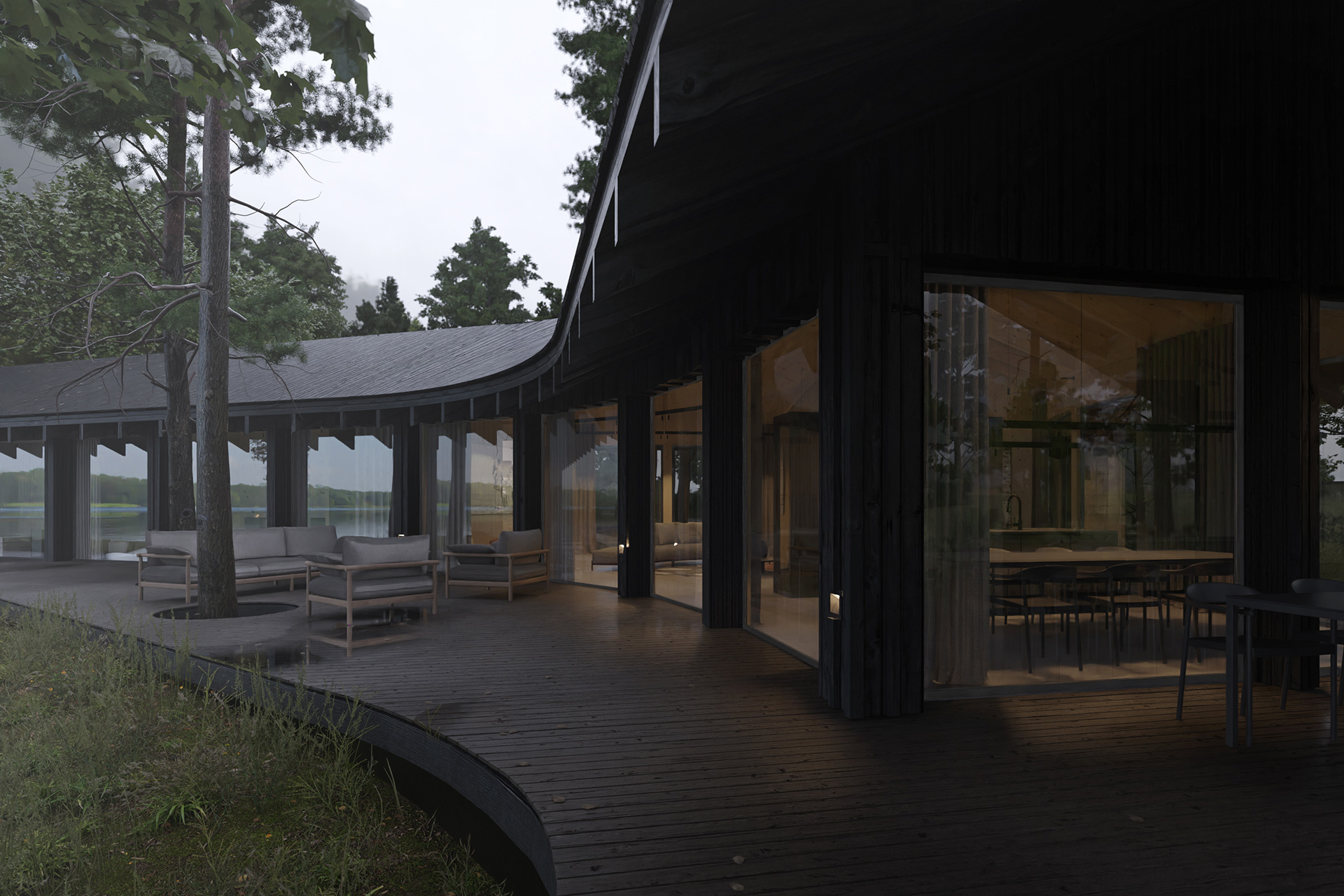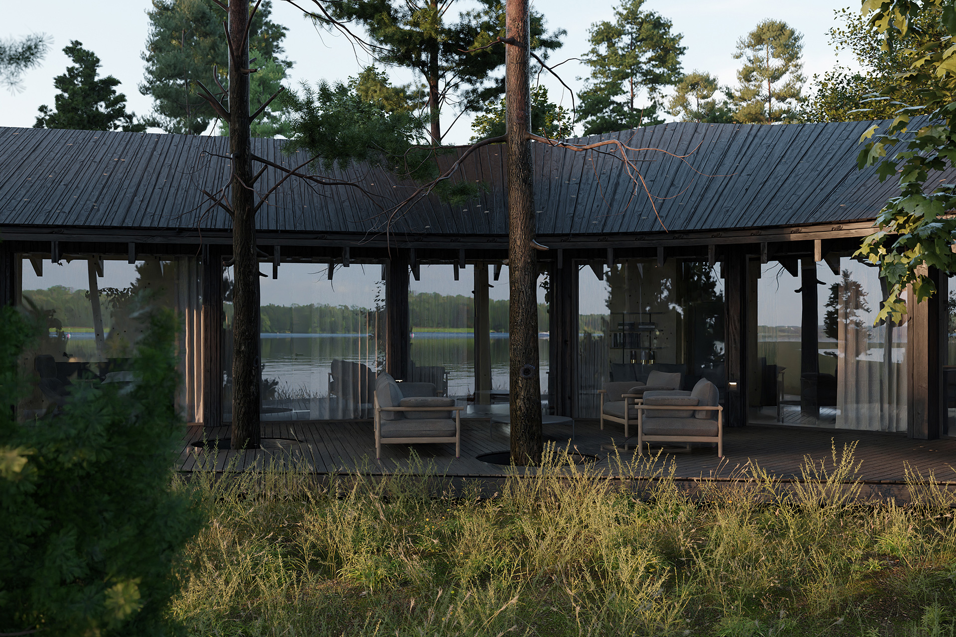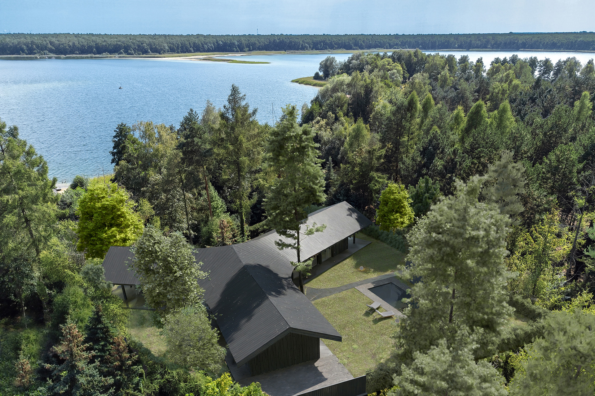 Dom Trójstronny nad jednym z malowniczych jezior Wielkopolski to wyjątkowy przykład harmonii między nowoczesną architekturą a naturalnym krajobrazem, stworzony przez doświadczonych inżynierów z Neostudio. Obiekt został zaprojektowany tak, aby w pełni wykorzystać walory zalesionej działki, na której się znajduje. Projekt ten stanowi nie tylko wyzwanie konstrukcyjne, ale także przykład przemyślanego podejścia do projektowania, które minimalizuje ingerencję w otaczający drzewostan, jednocześnie maksymalizując dostęp do zapierających dech w piersiach widoków na jezioro, lasy i okoliczne wzniesienia.
