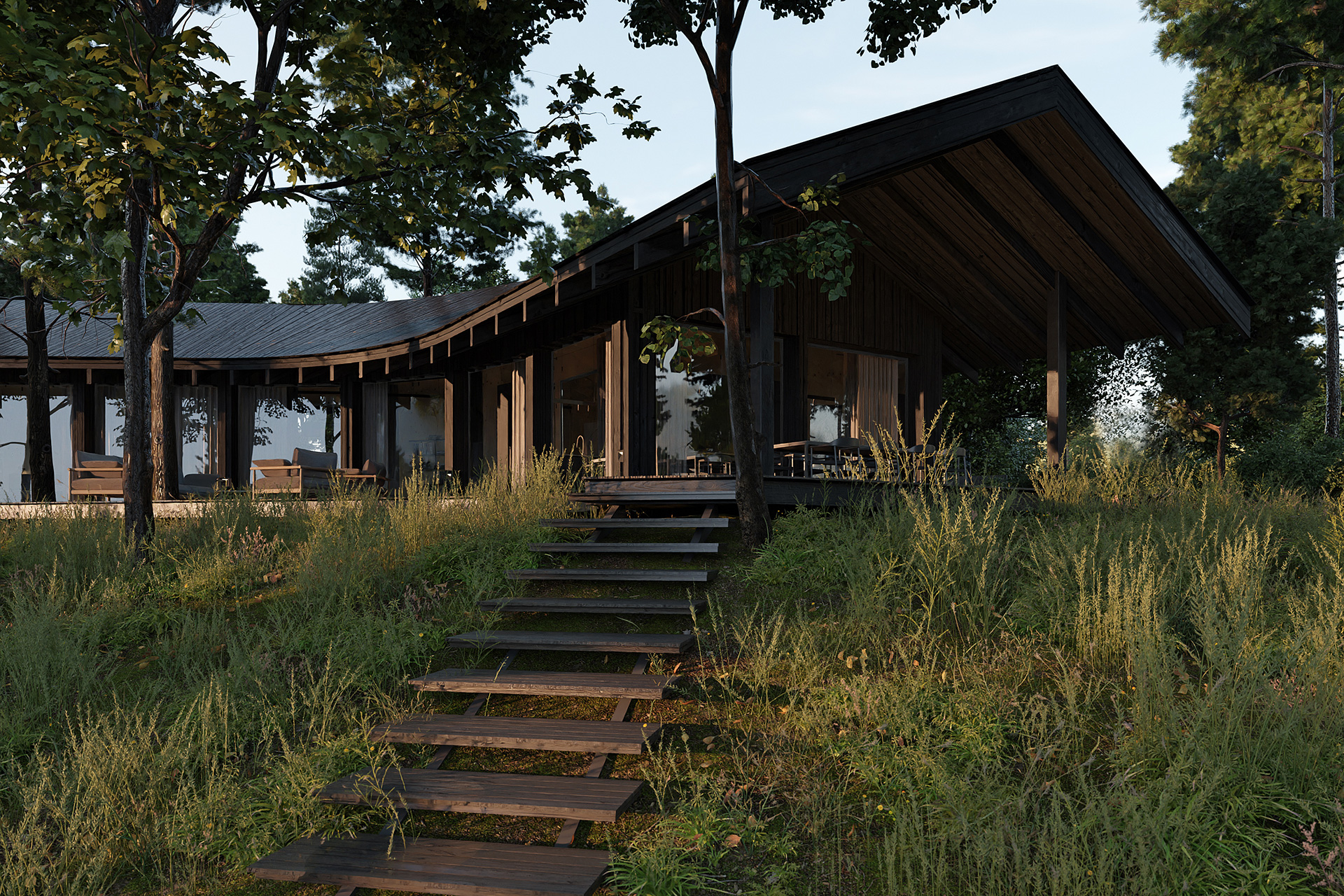 Jednym z kluczowych elementów projektu, który wyróżnia Neostudio, jest dbałość o zrównoważony design i minimalizację wpływu budynku na środowisko naturalne. Projekt Domu Trójstronnego uwzględnia wykorzystanie naturalnych materiałów oraz zastosowanie nowoczesnych technologii, które sprzyjają oszczędzaniu energii i minimalizują ślad węglowy. Autorzy zdecydowali się na zastosowanie takich rozwiązań jak systemy odzyskiwania ciepła, panele słoneczne oraz energooszczędne oświetlenie, co sprawia, że dom jest nie tylko piękny, ale także ekologiczny i ekonomiczny w eksploatacji.