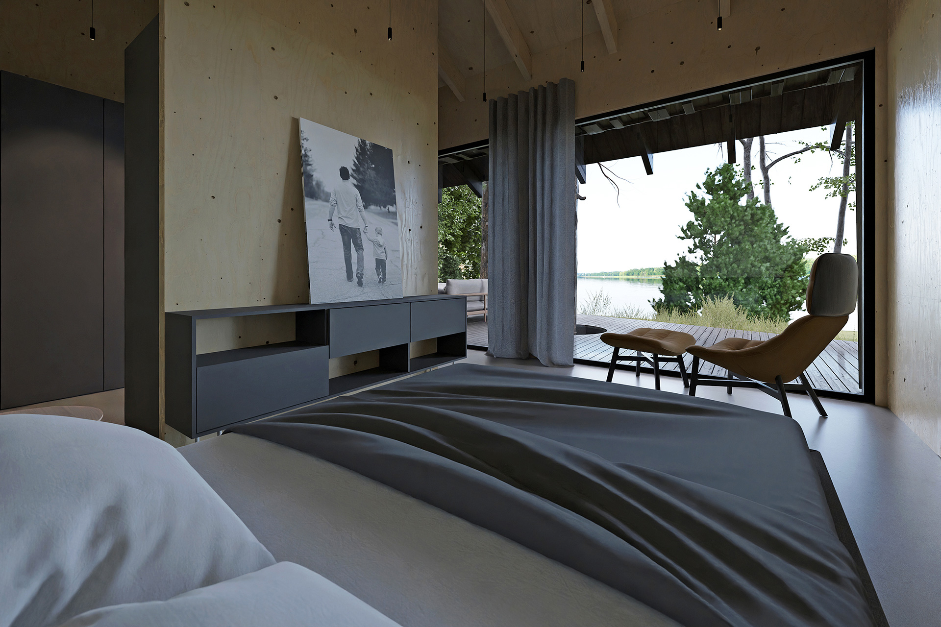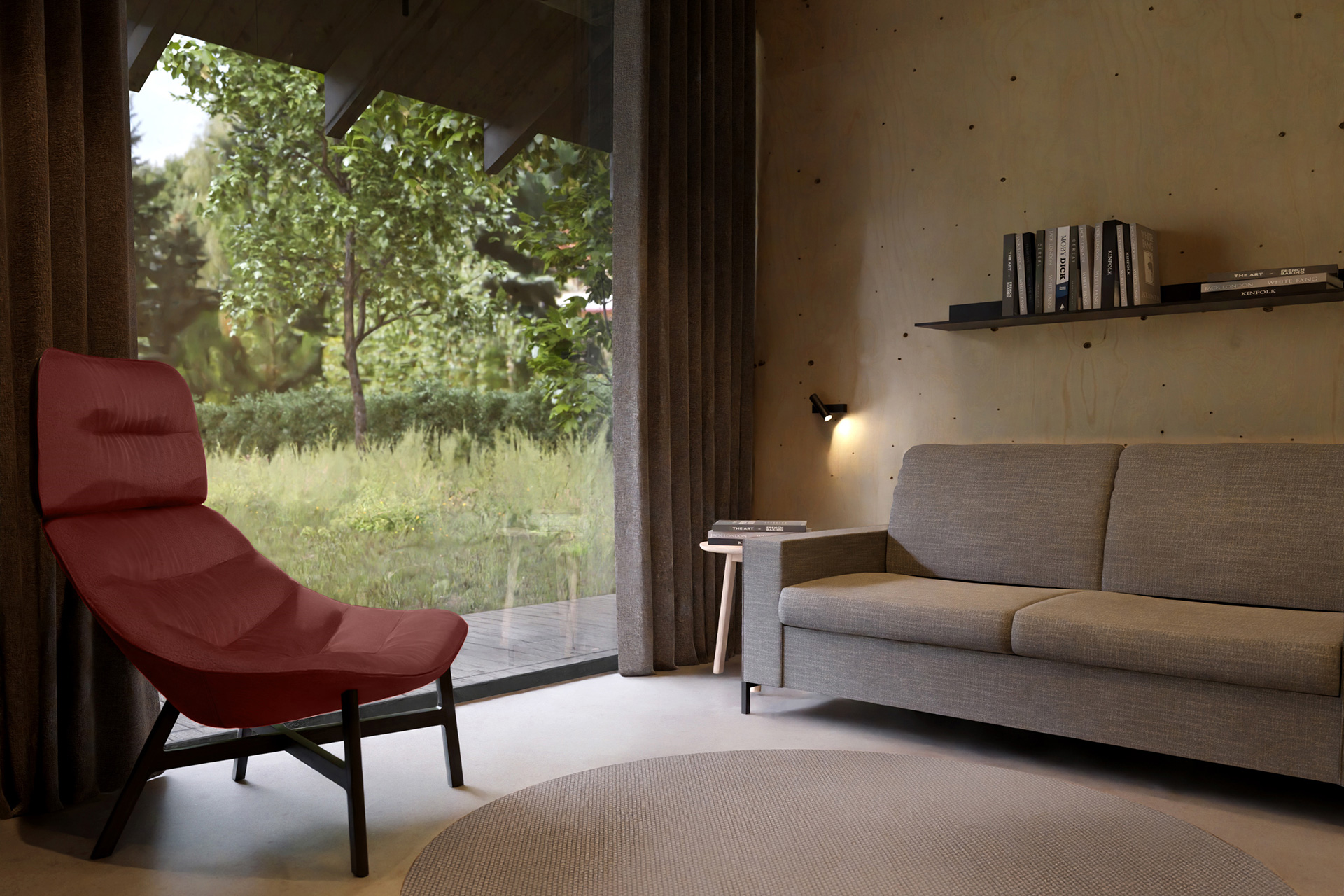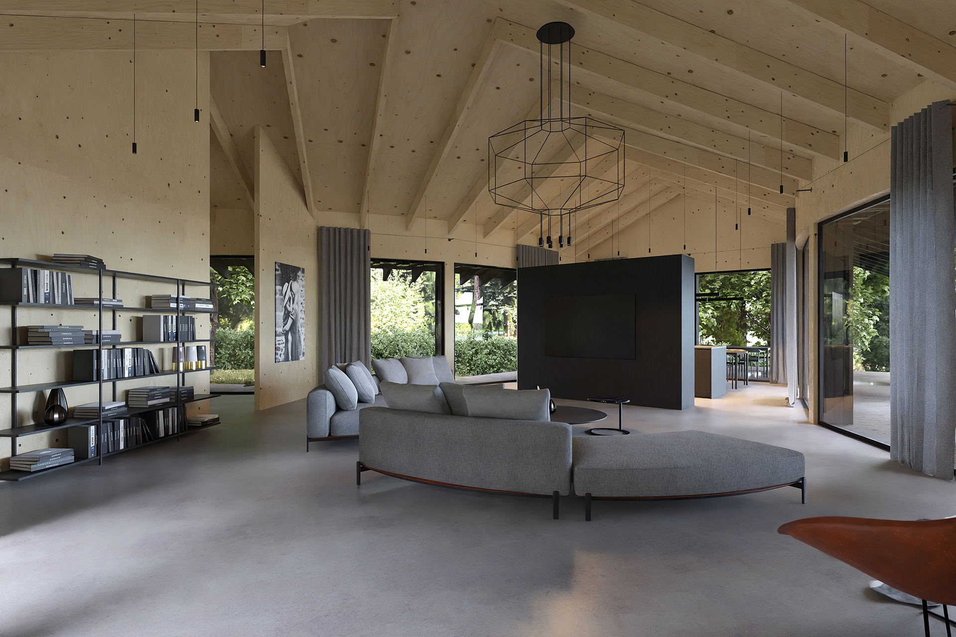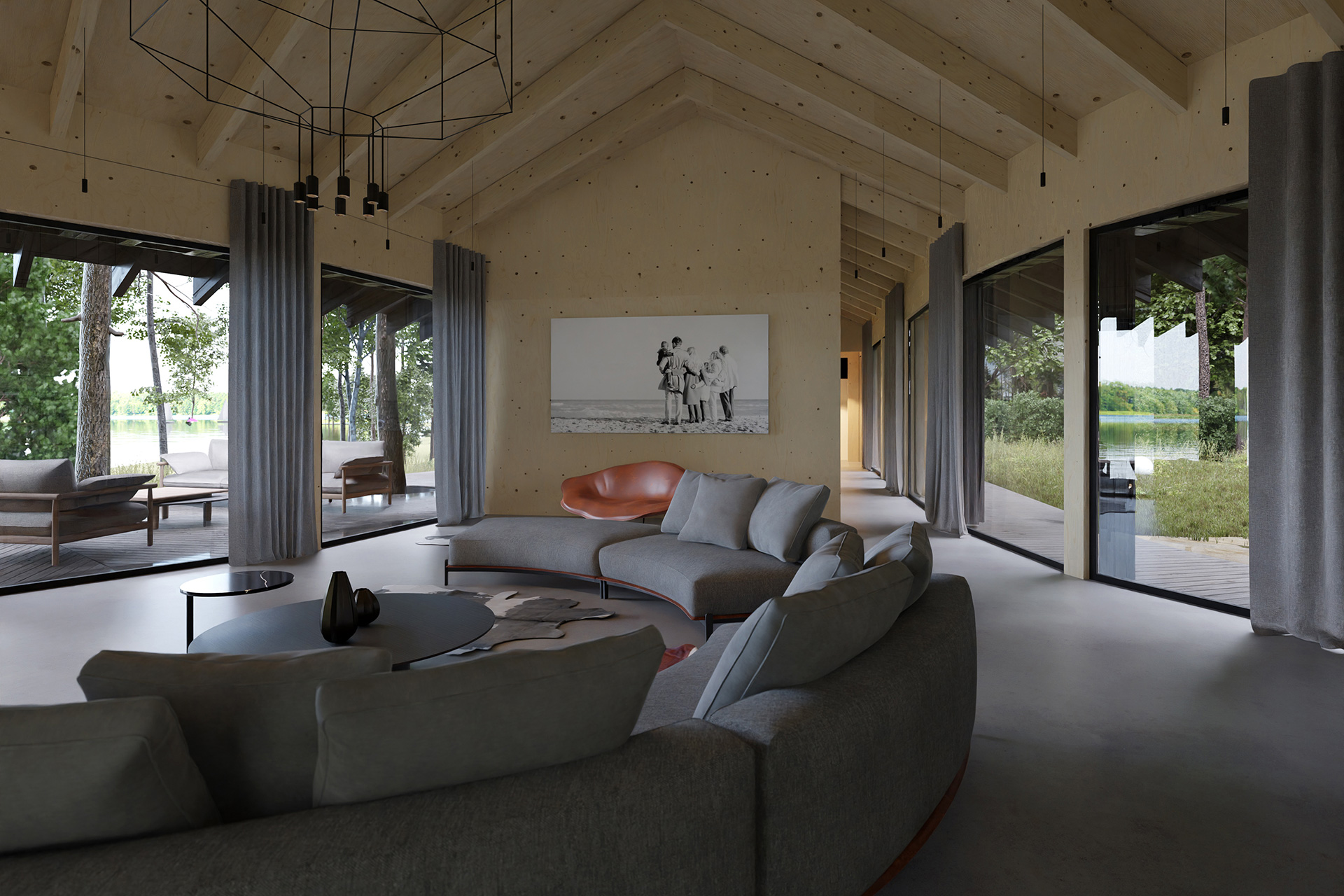 Wnętrze Domu Trójstronnego to kwintesencja harmonii z naturą, co jest wynikiem ścisłej współpracy projetantów wnętrz z z zespołem odpowiedzialnym za zewnętrzną architekturę budynku. Projektanci zadbali o to, aby wnętrza były jasne, przestronne i pełne naturalnej energii, co stanowi zamierzony kontrast w stosunku do ciemnej, tajemniczej fasady budynku. Wybór materiałów, takich jak drewno, beton i naturalne tkaniny, podkreśla bliskość domu z otaczającą go przyrodą. Projektanci wnętrz postawili na subtelne nawiązania do lokalnej natury, tworząc przestrzenie, które nie tylko zachwycają estetyką, ale także sprzyjają relaksowi i regeneracji sił.