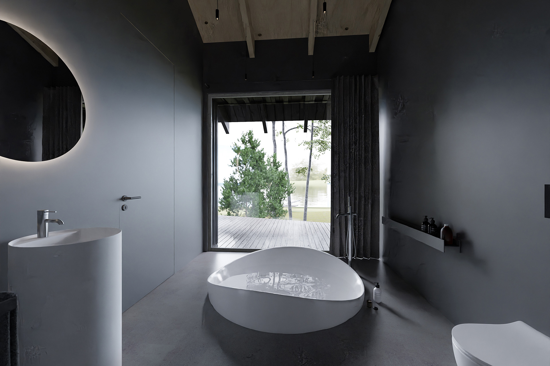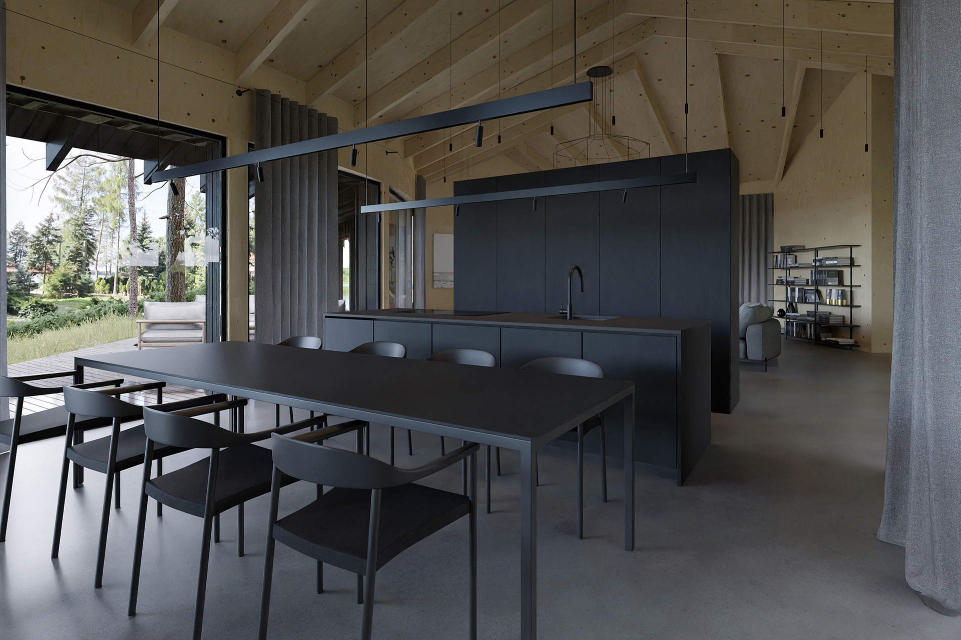 Wnętrze domu to gra kontrastów – zewnętrzna, ciemna fasada skrywa jasne, naturalne wnętrza pełne energii. Wykorzystanie naturalnych materiałów odzwierciedla związek domu z otaczającą go przyrodą, tworząc przestrzeń, która jednocześnie zapewnia komfort i w pełni korzysta z wyjątkowego położenia budynku. Projektanci wnętrz starannie dobrali materiały i układ wnętrz, aby podkreślić bliskość natury i harmonijną relację między domem a jego otoczeniem. Opracowany przez zespół projektowy, stanowi kompleksową realizację, obejmującą zarówno architekturę budynku, jak i jego wnętrza, dbając o każdy aspekt inwestycji. Projektanci wnętrz zadbali o każdy detal, zapewniając, że dom jest nie tylko estetyczny, ale także funkcjonalny.