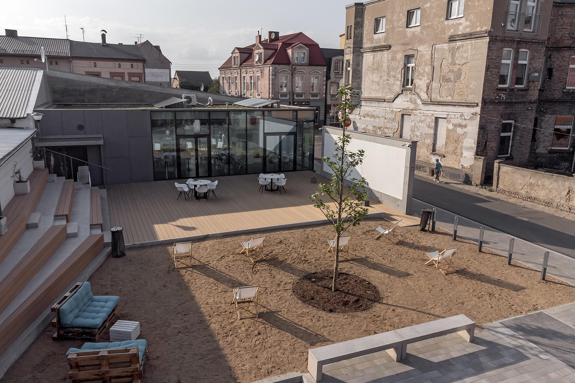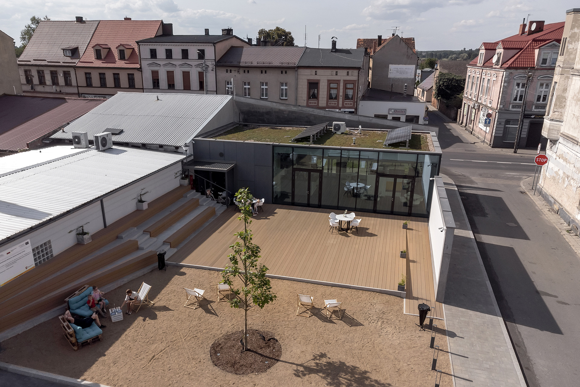 Jednym z założeń podstawowych było również odbetonowanie powierzchni poprzez wykonanie przepuszczalnych powierzchni w formie tarasu i powierzchni żwirowej. Na środku placu zaplanowano soliterowe drzewo – Platan oraz powierzchnię zieloną na dachu celem zmniejszenia wysp ciepła w mieście. Całość wyposażono w oświetlenie o niskim zużyciu energii zasilane energią słoneczną.