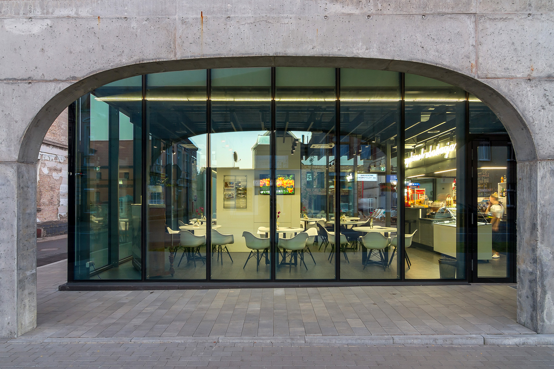Biuro projektowe zaproponowało budynek o jednokondygnacyjnej kubaturze o kształcie prostego płaskiego prostopadłościanu ze ścianami w około 3/4 przeszklonymi, a w 1/4 nieprzeziernymi w okładzinie z płyt włókno-cementowych. Pawilon odseparowano od elementu odgradzającego od ulicy. Stanowi uzupełnienie i zamknięcie urbanistyczne placu.