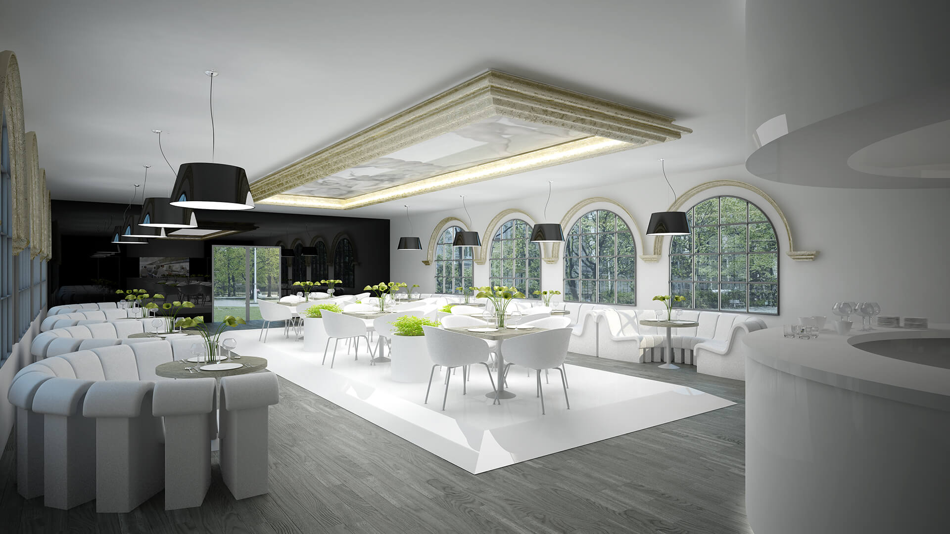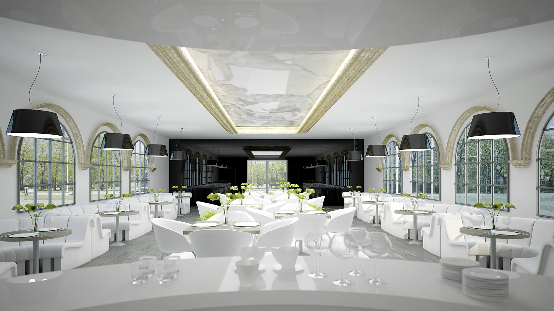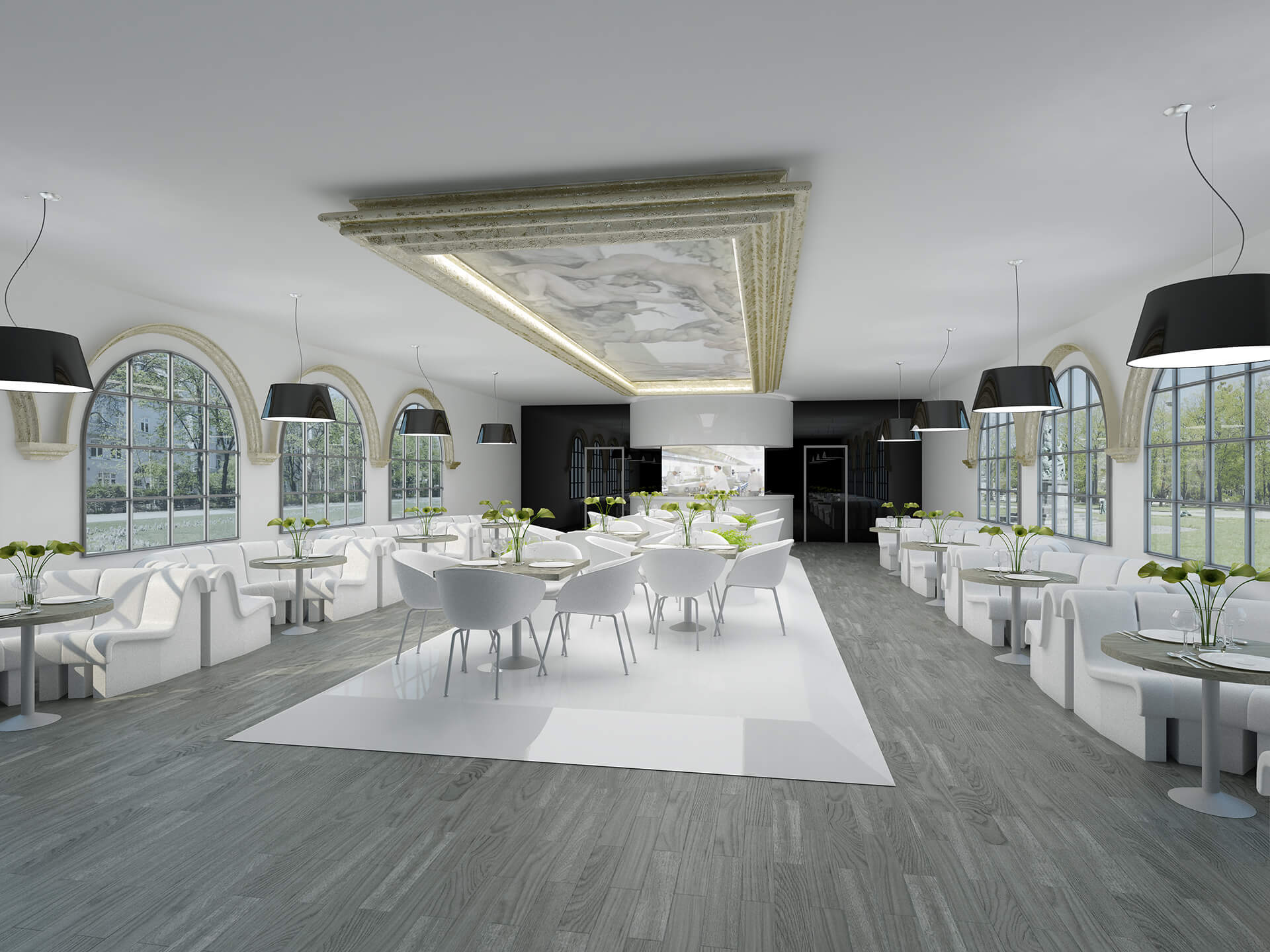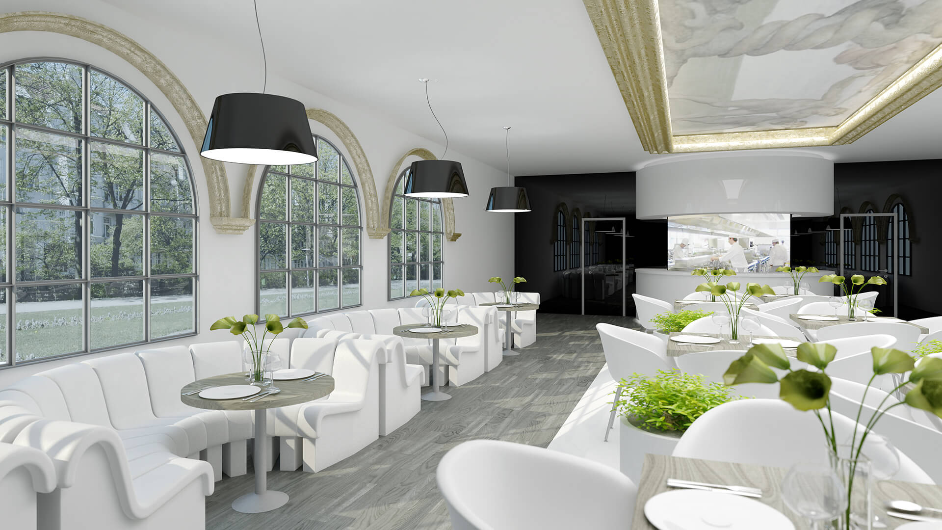 Projekt powstał jako obiekt wzorcowy do sieci kilku restauracji marki premium, lokowanych w głównych miastach Niemiec i Polski. Zorientowany na otwartych na świat i ceniących celebrowanie jedzenia ludzi, zakłada lokalizację w miejscach sąsiadujących z założeniami parkowymi, ogrodowymi czy terenami rekreacyjnymi, nad wodą lub w jej pobliżu. Projekt w Berlinie wykorzystuje istniejący budynek wykorzystywany jako magazyn. Przestrzeń sali konsumpcyjnej potraktowana jako otwarta, została podzielona podestem w posadzce oraz lokalnymi obniżeniami sufitu i skoncentrowaniu oświetlenia, dzięki czemu wyodrębniono wrażeniowo centralny fragment lokalu o charakterze bardziej przytulnym. Dominująca biel została przełamana została złotymi akcentami oraz czarnymi, połyskującymi ścianami szczytowymi i otwartą kuchnią, którą można obserwować przez szybę za barem. Założenie menu to serwowanie kuchni fusion dyskretnie zorientowanej na wpływy lokalne.