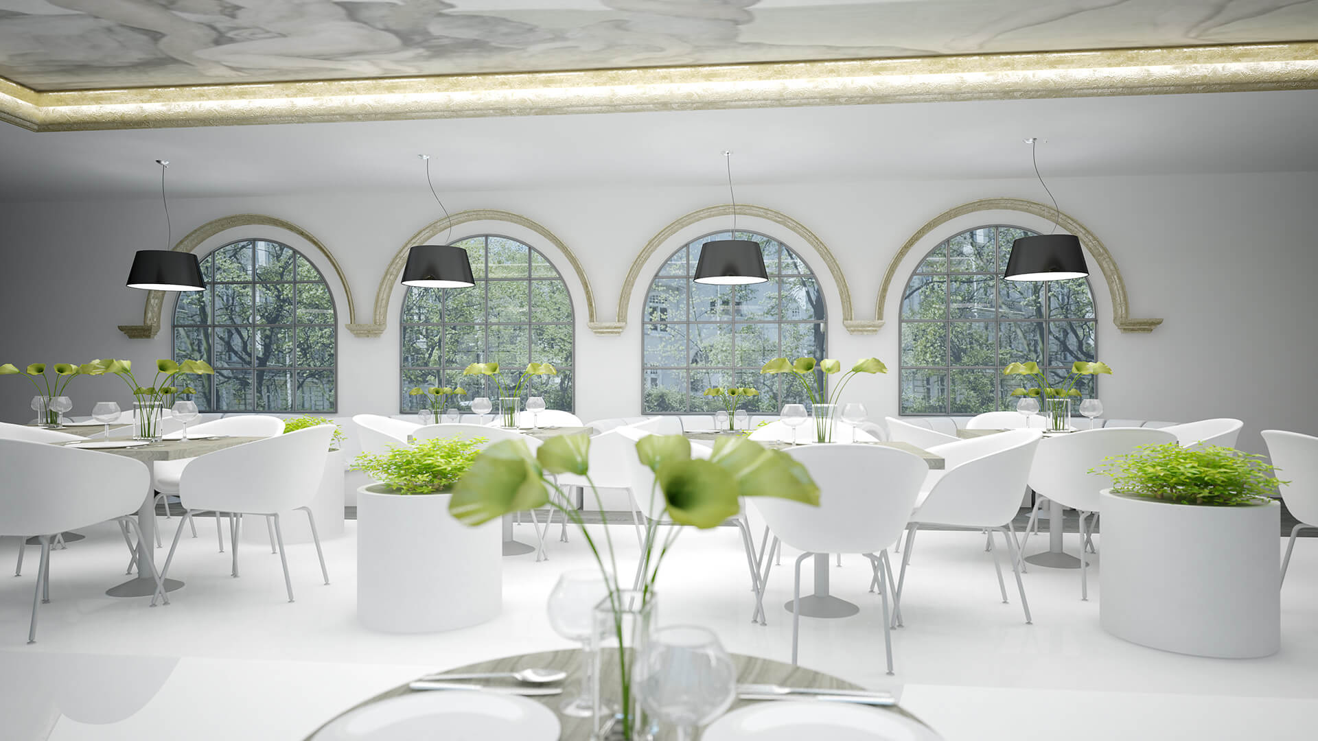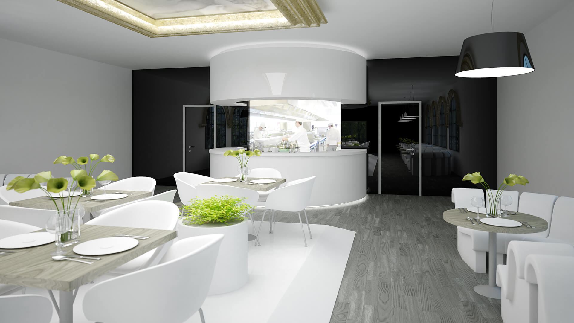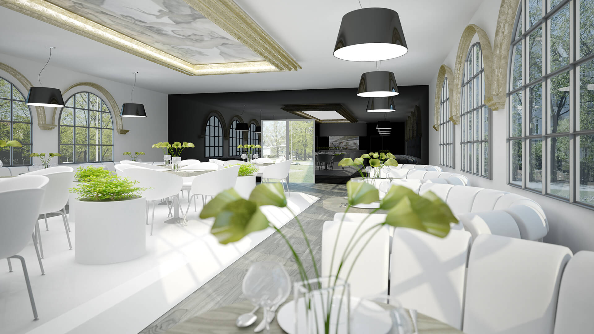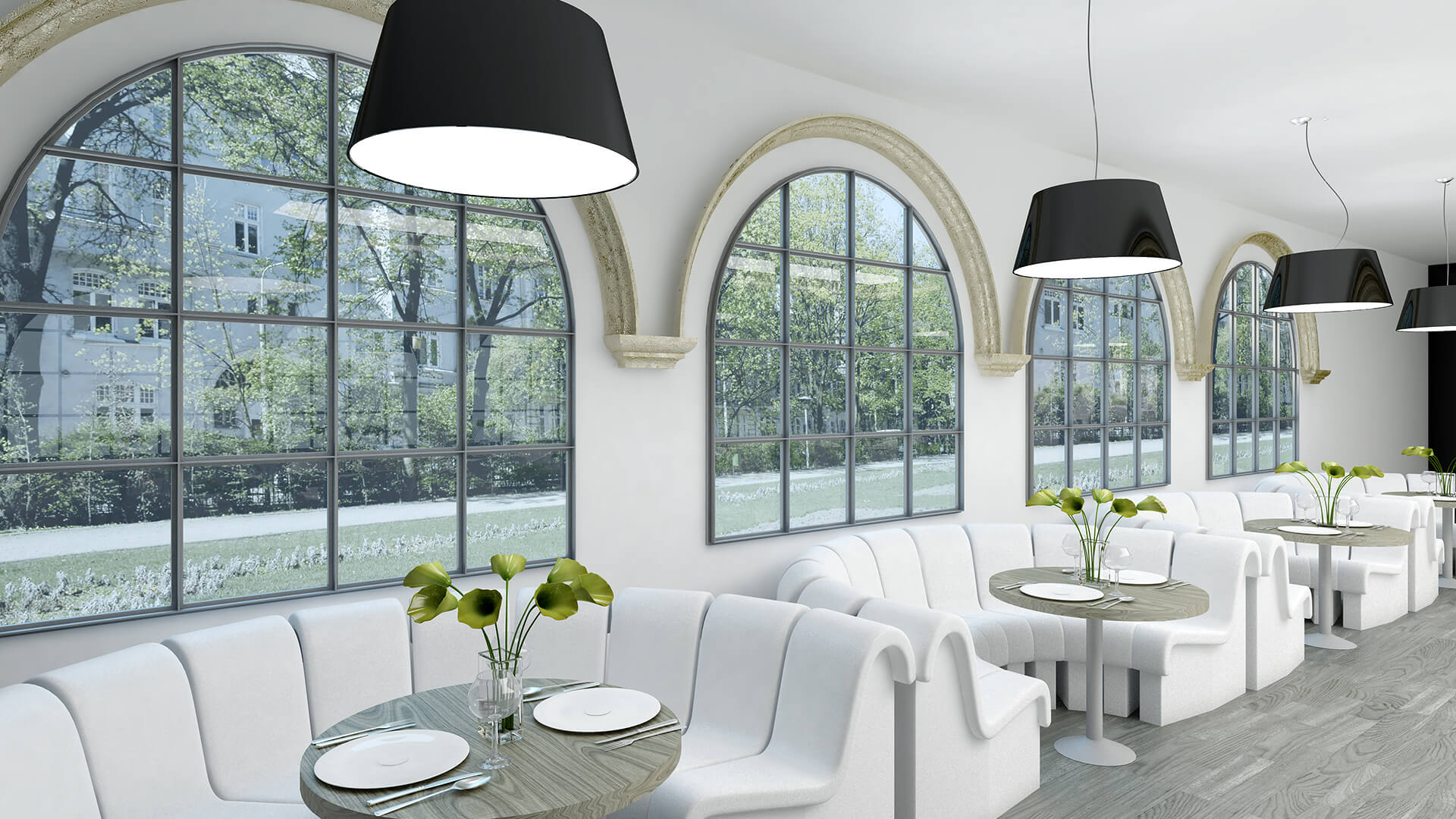 Projekt powstał jako obiekt wzorcowy do sieci kilku restauracji marki premium, lokowanych w głównych miastach Niemiec i Polski. Zorientowany na otwartych na świat i ceniących celebrowanie jedzenia ludzi, zakłada lokalizację w miejscach sąsiadujących z założeniami parkowymi, ogrodowymi czy terenami rekreacyjnymi, nad wodą lub w jej pobliżu. Projekt w Berlinie wykorzystuje istniejący budynek wykorzystywany jako magazyn. Przestrzeń sali konsumpcyjnej potraktowana jako otwarta, została podzielona podestem w posadzce oraz lokalnymi obniżeniami sufitu i skoncentrowaniu oświetlenia, dzięki czemu wyodrębniono wrażeniowo centralny fragment lokalu o charakterze bardziej przytulnym. Dominująca biel została przełamana została złotymi akcentami oraz czarnymi, połyskującymi ścianami szczytowymi i otwartą kuchnią, którą można obserwować przez szybę za barem. Założenie menu to serwowanie kuchni fusion dyskretnie zorientowanej na wpływy lokalne.